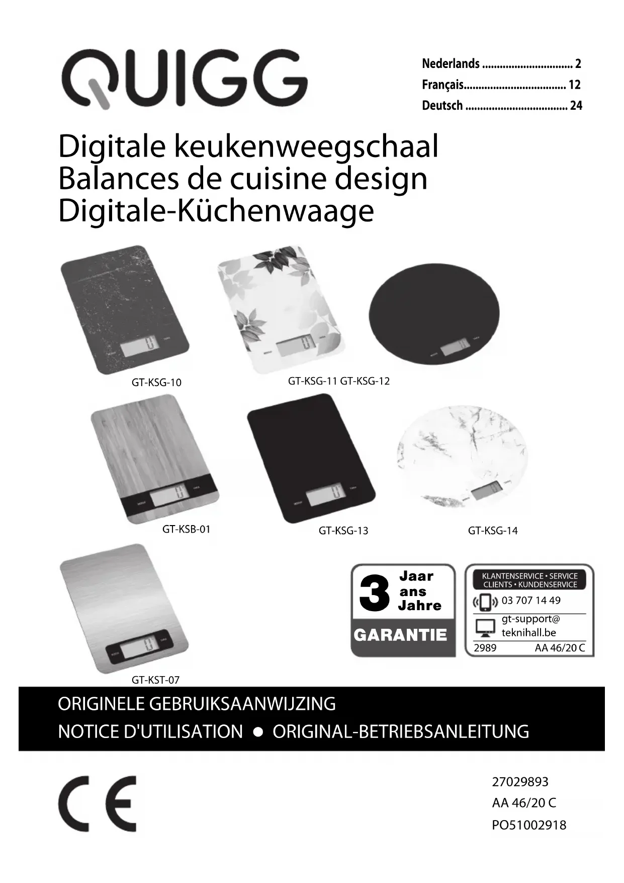 - Omgevingstemperatuur: +10 °C - 40 °C Omdat onze producten voortdurend verder ontwikkeld en verbeterd worden, zijn wijzigingen in het design en technische veranderingen mogelijk. Deze gebruiksaanwijzing kan ook als pdf-bestand van onze homepage www.gt-support.de worden gedownload. Fout Mogelijke oorzaak en remedie Werkt niet. - Is de weegschaal ingeschakeld? - Is de batterij leeg? De weegschaal geeft klaarblijkelijk ver- keerde weegresultaten weer. - Staat de weegschaal op een vaste, vlakke ondergrond? - Bevindt er zich in de buurt van de weegschaal een apparaat, dat elek- tromagnetische storingen kan ver- oorzaken? - Zet de weegschaal terug op de fabrieksinstellingen, zie pagina 8. In het display wordt „Err“ weergegeven. - De maximale capaciteit van de weegschaal van 6 kg werd over- schreden. In het display wordt „LO“ weergegeven. - De batterij is leeg, zie “Vervangen van de batterij”. Druckbuch Kuechenwaage BEL.book Seite 10 Dienstag, 12. Mai 2020 11:18 1111 Conformiteitsverklaring De conformiteit van het product met de wettelijk voorgeschreven normen wordt gewaarborgd. De volledige Conformiteitsverklaring vindt u op het internet op www.gt-support.de. Met dit symbool gemarkeerde producten voldoen aan alle toepasselijke Gemeenschapsvoorschriften van de Europese Economische. Druckbuch Kuechenwaage BEL.book Seite 11 Dienstag, 12. Mai 2020 11:18 1112 Sommaire Contenu de l'emballage p. 12