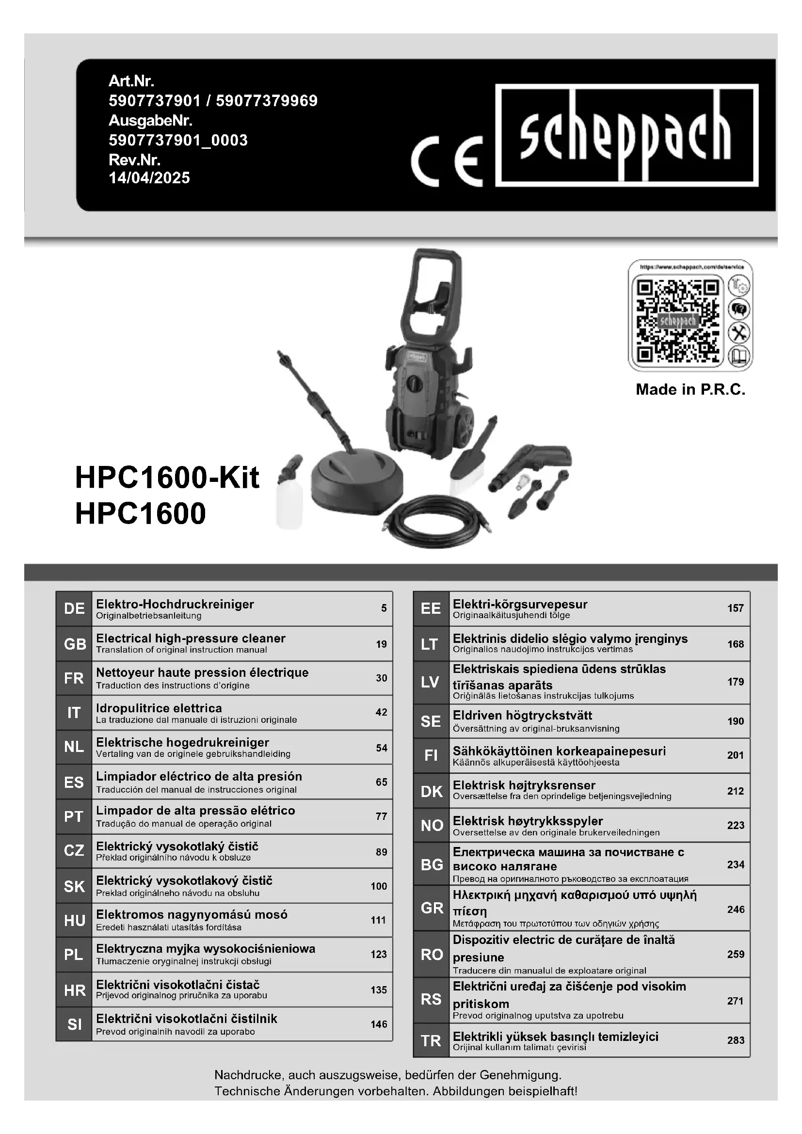 Retrouvez gratuitement la notice de l'appareil HPC1600 SCHEPPACH au format PDF.