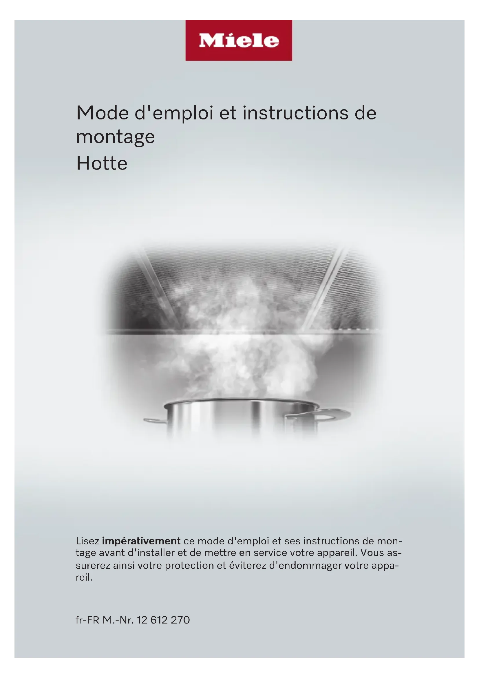 Mode d'emploi et instructions de montage Hotte Lisez impérativement ce mode d'emploi et ses instructions de mon- tage avant d'installer et de mettre en service votre appareil. Vous as- surerez ainsi votre protection et éviterez d'endommager votre appa- reil. fr-FR M.-Nr. 12 612 270Table des matières