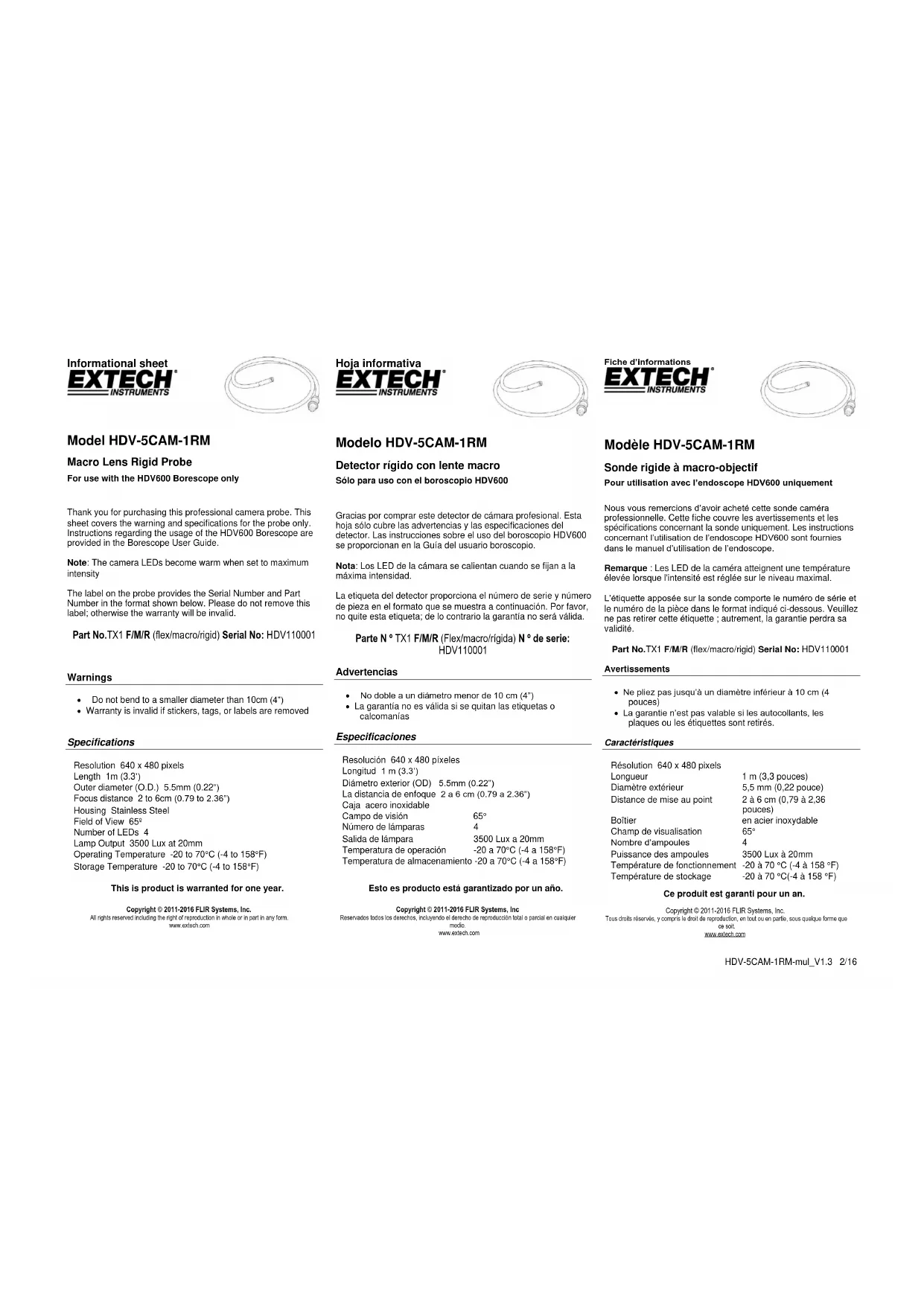 Modèle HDV-5CAM-1RM Sonde rigide à macro-objectif Pour utilisation avec l’endoscope HDV600 uniquement Nous vous remercions d’avoir acheté cette sonde caméra professionnelle. Cette fiche couvre les avertissements et les spécifications concernant la sonde uniquement. Les instructions concernant l’utilisation de l’endoscope HDV600 sont fournies dans le manuel d’utilisation de l’endoscope. Remarque : Les LED de la caméra atteignent une température élevée lorsque l'intensité est réglée sur le niveau maximal. L’étiquette apposée sur la sonde comporte le numéro de série et le numéro de la pièce dans le format indiqué ci-dessous. Veuillez ne pas retirer cette étiquette ; autrement, la garantie perdra sa validité. Part No.TX1 F/M/R (flex/macro/rigid) Serial No: HDV110001 Avertissements Ne pliez pas jusqu’à un diamètre inférieur à 10 cm (4 pouces) La garantie n’est pas valable si les autocollants, les plaques ou les étiquettes sont retirés. Caractéristiques Résolution 640 x 480 pixels Longueur 1 m (3,3 pouces) Diamètre extérieur 5,5 mm (0,22 pouce) Distance de mise au point 2 à 6 cm (0,79 à 2,36 pouces) Boîtier en acier inoxydable Champ de visualisation 65° Nombre d’ampoules 4 Puissance des ampoules 3500 Lux à 20mm Température de fonctionnement -20 à 70 °C (-4 à 158 °F) Température de stockage -20 à 70 °C(-4 à 158 °F) Ce produit est garanti pour un an. Copyright © 2011-2016 FLIR Systems, Inc. Tous droits réservés, y compris le droit de reproduction, en tout ou en partie, sous quelque forme que ce soit. www.extech.comHDV-5CAM-1RM-mul_V1.3 2/16
