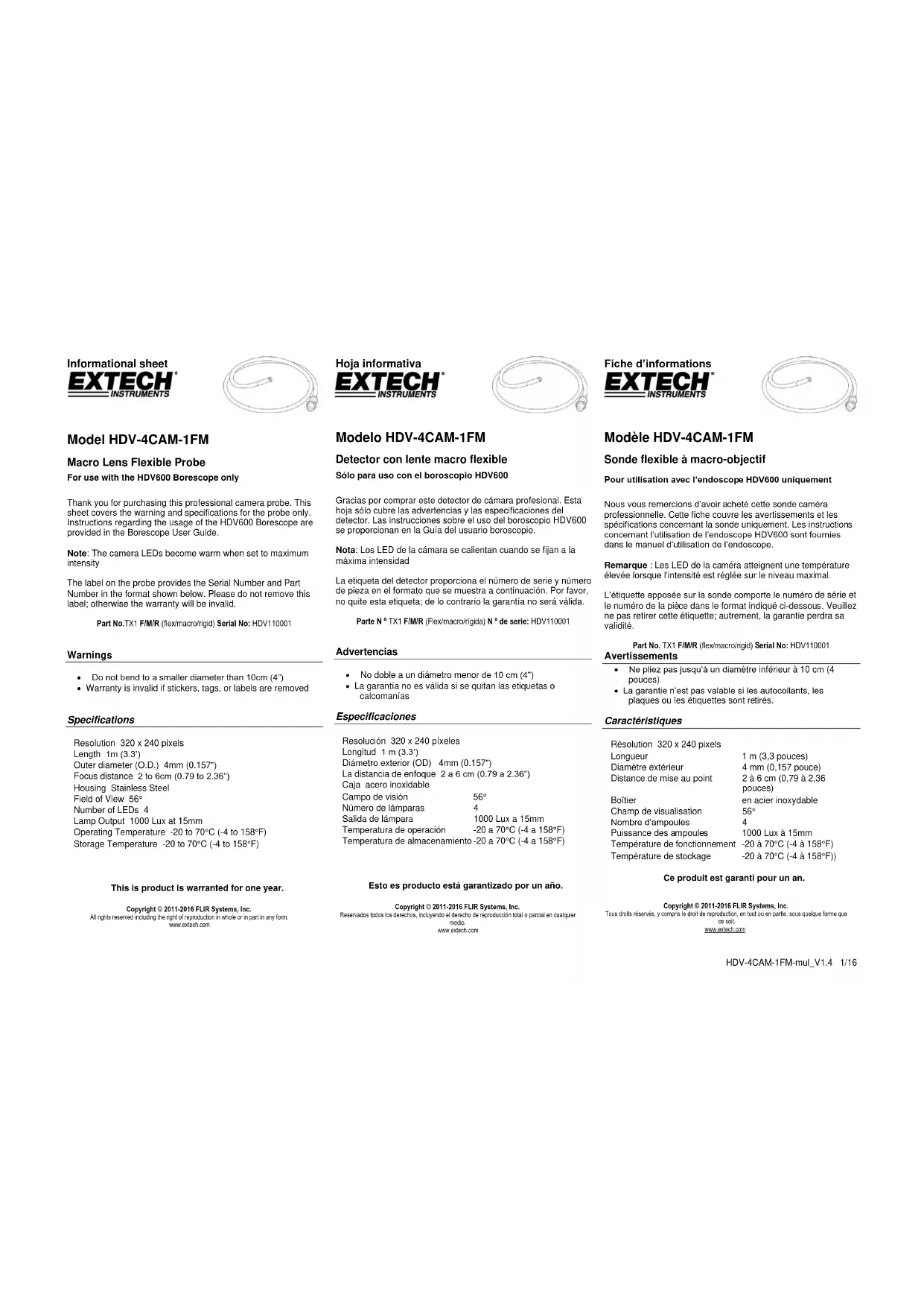 Copyright © 2011-2016 FLIR Systems, Inc. Tous droits réservés, y compris le droit de reproduction, en tout ou en partie, sous quelque forme que ce soit. www.extech.comHDV-4CAM-1FM-mul_V1.4 1/16