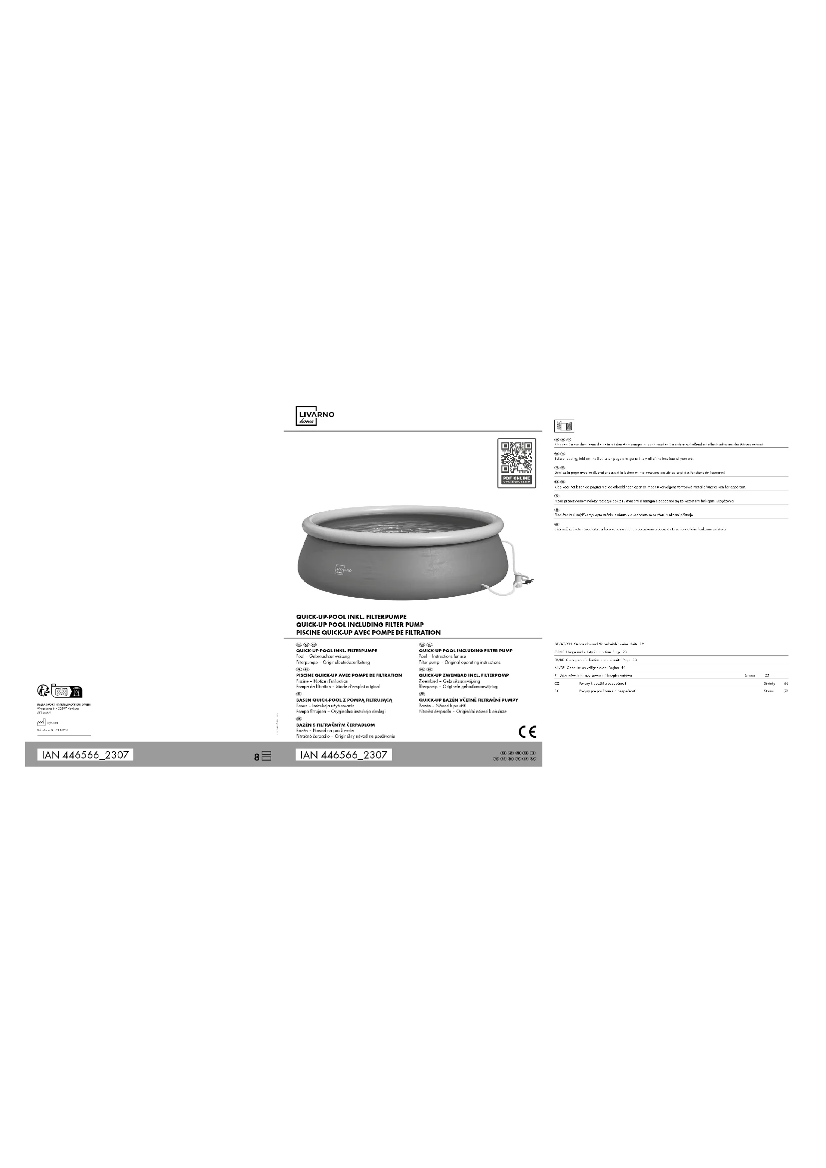 - Consultez un spécialiste. Mise.au.rebut Le symbole ci-contre indique que ce produit est soumis à la directive 2012/19/UE. Cette directive stipule qu’à la fin de sa durée d’utilisation, vous ne devez pas jeter ce produit avec les déchets ménagers normaux, mais le déposer dans des centres de collecte spéciale- ment aménagés, des centres de recyclage ou des entreprises de traitement des déchets. Protégez l’environnement et procédez à une éli- mination dans le respect des normes en vigueur. Les piles/batteries ne doivent pas être jetées avec les ordures ménagères. Elles peuvent conte- nir des métaux lourds toxiques et sont soumises à un traitement spécial des déchets. Les symboles chimiques des métaux lourds sont les suivants : Cd = cadmium, Hg = mercure, Pb = plomb. Alors, retournez les piles/batteries usagées à un point de collecte municipal. Ce produit est recyclable. Il est soumis à la responsabilité élargie du fabricant et est collecté séparément. Vous obtiendrez plus d’informations relatives à l’élimination du produit usagé auprès de votre commune ou de votre municipalité. Éliminez le produit et l’emballage dans le respect de l’environnement. Conservez les matériaux d’emballage (comme les sachets en plastique) hors de portée des enfants. Notez le marquage des matériaux d’emballage lors du tri des déchets. Ceux-ci sont marqués par les abrévia- tions (a) et les chiffres (b) avec la signification suivante : 1 - 7 : plastique / 20 - 22 : papier et carton / 80 - 98 : matériaux composites. Le produit et les matériaux d’emballage sont recyclables. Éliminez-les séparément pour une meilleure gestion des déchets.43 Originale.Déclaration.de.conformité.CE. Nous soussignés, l’entreprise Delta-Sport Handelskontor GmbH Wragekamp 6 22397 Hambourg attestons que la présente déclaration de conformité est établie sous la seule responsabilité du fabricant. IAN : Produit : N° du modèle : 446566 Pompe de filtration 53011A