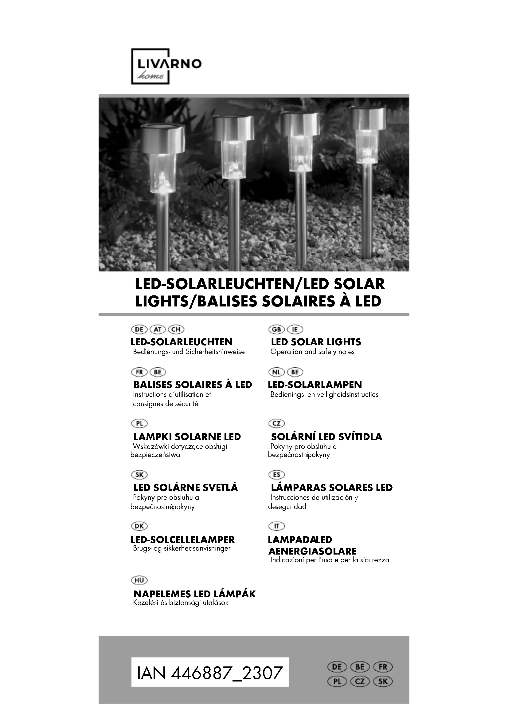 u qui diminuent tellement cet usage que l‘acheteur ne l‘aurait pas acquise, ou n‘en aurait donné qu‘un moindre prix, s‘il les avait connus. Article 1648 1er alinéa du Code civil L‘action résultant des vices rédhibitoires doit être intentée par l‘acquéreur dans un délai de deux ans à compter de la découverte du vice. Les pièces détachées indispensables à l’utilisation du produit sont dispo- nibles pendant la durée de la garantie du produit. Le produit a été fabriqué selon des critères de qualité stricts, et contrôlé consciencieusement avant sa livraison. En cas de défaut de matériau ou de fabrication, vous avez des droits légaux vis-à-vis du vendeur du produit. Vos droits légaux ne sont en aucun cas limités par notre garantie mentionnée ci-dessous. La garantie de ce produit est de 3 ans à partir de la date d’achat. La période de garantie commence à la date d’achat. Conservez l’original de la preuve d’achat dans un endroit sûr car ce document est néces- saire pour prouver l’achat. Tout dommage ou défaut déjà présent au moment de l’achat doit être signalé immédiatement après le déballage du produit. Si le produit présente un défaut de matériau ou de fabrication dans les 3 ans qui suivent la date d’achat, nous le réparerons ou le remplace- rons - à notre choix - gratuitement pour vous. La période de garantie n’est pas prolongée par une demande de garantie acceptée. Cette mesure s’applique également pour les pièces remplacées et réparées. Cette garantie est annulée si le produit a été endommagé ou utilisé ou entretenu de manière incorrecte. La garantie couvre les défauts de matériels et de fabrication. Cette garantie ne couvre pas les pièces du produit soumises à une usure normale, et qui sont donc considérées comme des pièces d’usure (par exemple les piles, les piles rechargeables, tuyaux, les cartouches d’encre), ni les dom- mages aux pièces fragiles, par exemple les interrupteurs ou les pièces en verre. La période de garantie s’applique également à la batterie sur ce produit.34 FR/BE Faire valoir sa garantie Pour garantir la rapidité d’exécution de la procédure de garantie, veuillez respecter les indications suivantes : Veuillez conserver le ticket de caisse et la référence du produit (IAN 446887_2307) à titre de preuve d’achat pour toute demande. Le numéro de référence de l’article est indiqué sur la plaque d’identi- fication, gravé sur la page de titre de votre manuel (en bas à gauche) ou sur un autocollant apposé sur la face arrière ou inférieure du produit. En cas de dysfonctionnement du produit, ou de tout autre défaut, contactez en premier lieu le service après-vente par téléphone ou par e-mail aux coordonnées indiquées ci-dessous. Vous pouvez alors envoyer franco de port tout produit considéré comme défectueux au service clientèle indiqué, accompagné de la preuve d’achat (ticket de caisse) et d’une description écrite du défaut avec mention de sa date d’apparition. Service après-vente Service après-vente France Tél. : 0800904879 E-Mail : owim@lidl.fr Service après-vente Belgique Tél. : 080071011 Tél. : 80023970 (Luxembourg) E-Mail : owim@lidl.be35 NL/BE Legenda van de gebruikte pictogrammen ...........................................................Pagina 36 Inleiding .........................................................................Pagina 36 Correct gebruik .................................................................Pagina 36 Beschrijving van onderdelen en functies .........................Pagina 36 Inhoud verpakking ............................................................Pagina 37 Technische gegevens ........................................................ Pagina 37 Veiligheidsinstructies ..........................................Pagina 37 Productspecifieke veiligheidsinstructies ............................Pagina 38 Veiligheidsinstructies voor batterijen/accu‘s ................... Pagina 38 Functionering .............................................................Pagina 39 Klaarmaken voor gebruik .............................Pagina 39 Het product installeren ......................................................Pagina 39 Het product instellen .........................................................Pagina 39 De oplaadbare batterij vervangen ..................................Pagina 40 De oplaadbare batterij opladen ......................................Pagina 40 Onderhoud en verzorging .............................Pagina 41 Problemen oplossen ............................................ Pagina 41 Afvoer ..............................................................................Pagina 41 Garantie ......................................................................... Pagina 42 Afwikkeling in geval van garantie ...................................Pagina 43 Service ...............................................................................Pagina 4336 NL/BE Legenda van de gebruikte pictogrammen Spatbestendig Gelijkstroom/-spanning De CE-markering duidt op conformiteit met relevante EU-richtlijnen die van toepassing zijn op dit product. Veiligheidsinstructies Instructies LED-solarlampen Inleiding Hartelijk gefeliciteerd met de aankoop van uw nieuwe product. U heeft voor een hoogwaardig product gekozen. De gebruiksaanwijzing is een deel van het product. Deze bevat belangrijke aanwijzingen voor veiligheid, gebruik en verwijdering. Maakt U zich voor de ingebruik- name van het product met alle bedienings- en veiligheidsvoorschriften vertrouwd. Gebruik het product alleen zoals beschreven en voor de aangegeven toepassingsgebieden. Overhandig alle documenten bij doorgifte van het product aan derden. Correct gebruik Het product is bedoeld voor gebruik buiten. Het product is niet bedoeld voor commercieel gebruik of voor gebruik in andere toepassingen. Niet geschikte voor verlichting van huishoudelijke kamers.