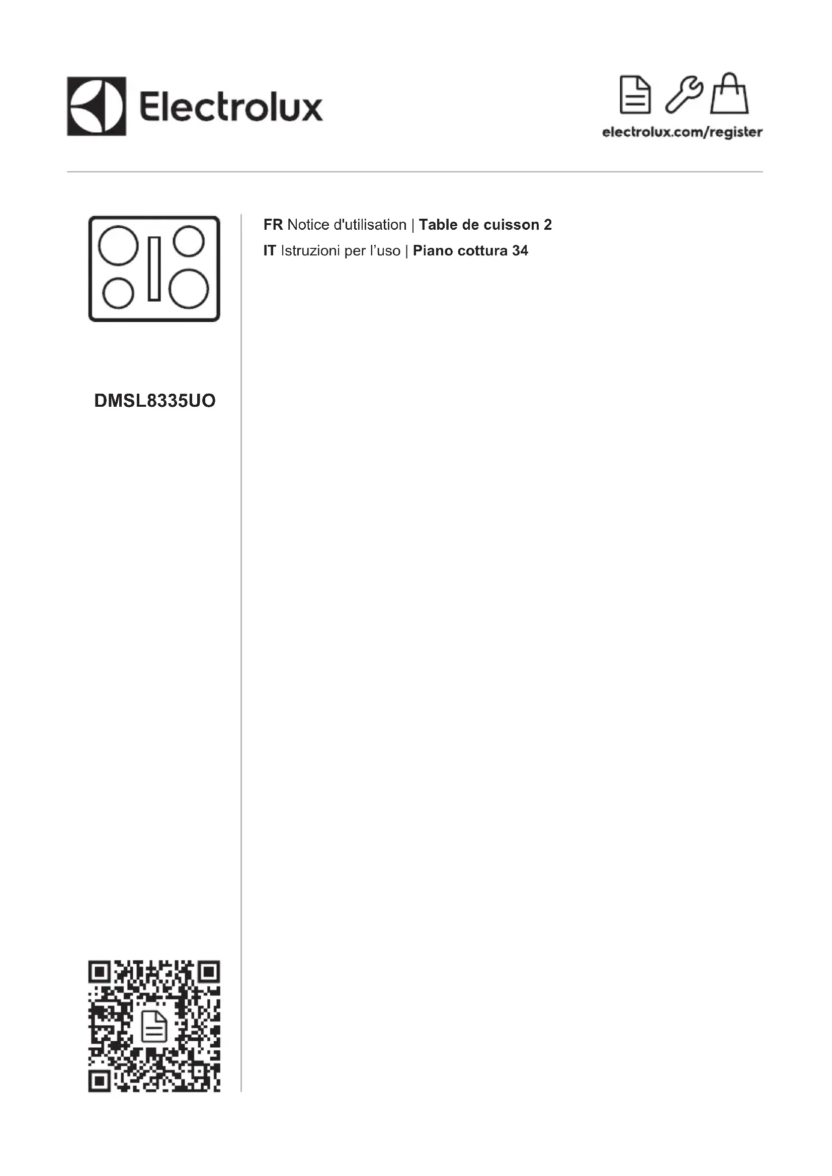 DMSL8335UO FR Notice d'utilisation | Table de cuisson 2 IT Istruzioni per l’uso | Piano cottura 34Bienvenue chez Electrolux ! Nous vous remercions d’avoir choisi l’un de nos appareils. Obtenir des conseils d’utilisation, des brochures, un dépanneur, des informations surle service et les réparations :www.electrolux.com/supportSous réserve de modifications.