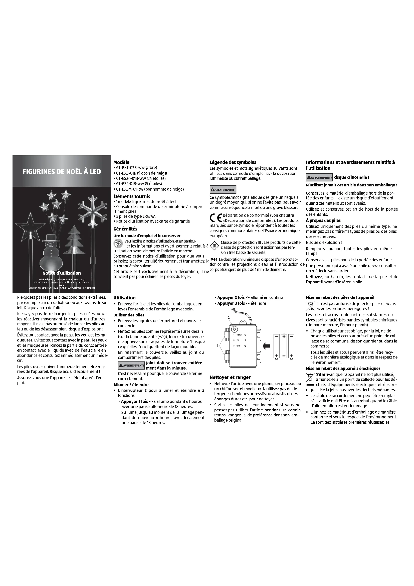 Puissance totale : 0,28 W Alimentation : ca.0,5 m Entrée : 4,5 V Modèle : GT-GS24-01B-ww (24 étoiles) Puissance totale : 0,5 W Alimentation : ca.0,5 m Entrée : 4,5 V Comme nos produits sont constamment en dévelop- pement et en amélioration, des modifi cations tech- niques et de design peuvent survenir. On ne peut pas changer les LED. L’alimenta tion de cet article ne peut être raccou rcie ! Les bâtons lumineux ne peuvent pas être connec- tés avec d’autres bâtons lumineux ou guirlandes. Ce mode d’emploi peut également être téléchar- gé au format PDF depuis notre site Internet www.gt-support.de Déclaration de conformité La conformité du produit aux standards prescrits par la loi est garantie. La déclaration de conformité UE complète peut être consultée sur Internet à l’adresse : www.gt-support.de CARTE DE GARANTIE (à partir de la date d’achat (conservez votre reçu)) Article : FIGURINES DE NOËL À LED (Art. 6863)S’il vous plaît sélectionnez : GT-GS24-01B-ww (24 étoiles) GT-GS5-01B-ww (5 étoiles) GT-BXT-02B-ww (arbre) GT-BXS-01B (fl ocon de neige) GT-BXSM-01-cw (bonhomme de neige) RevendeurNom de l’entreprise :Rue/No. :Code postal, lieu :AcheteurNom :Rue/No. :Code postal, lieu :Mail : Signature : (Pour les messages concernant l’état en cas de réparation)Chère cliente, cher client, Nos produits sont soumis à des contrôles de qualité rigoureux. Si malgré ces contrôles, votre appareil ne fonctionne pas correctement, nous vous demandons de contacter le SAV indiqué ci-dessous. Dans le cas d’une réclamation veuillez contacter notre hotline SAV au préalable par téléphone, qui vous renseignera sur les modalités. S’il vous plaît, n’envoyez pas votre article sans appel préalable !Globaltronics Service Center, Kleyling SAS / zeitlos design und vertriebs GmbHTransports Internationaux, RN 415, 68600 AlgolsheimHotline : 01 40 82 92 26Mail : gt-support@zeitlos-vertrieb.deConditions de garantie (sans pour autant réduire les droits légaux) :