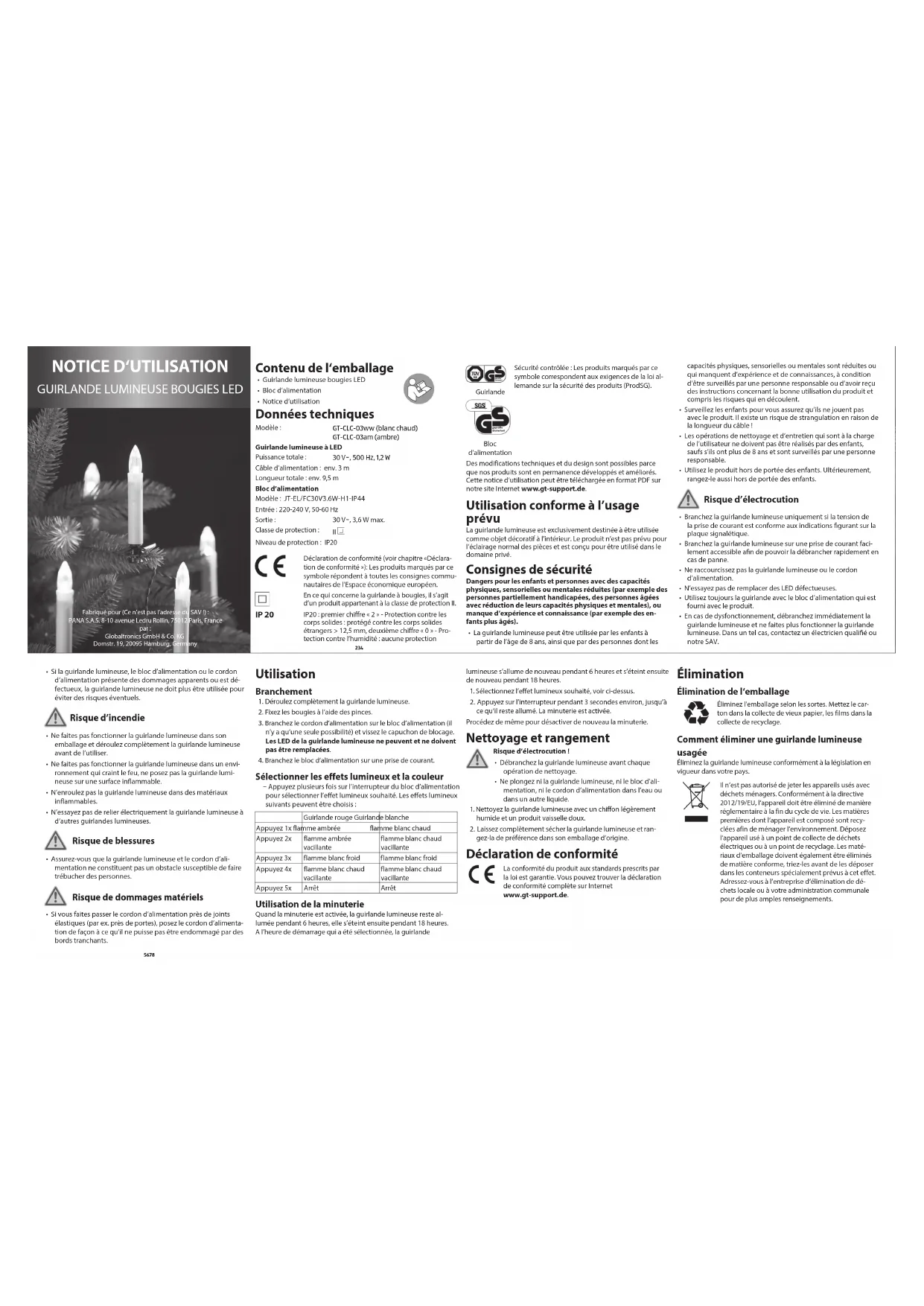 gez-la de préférence dans son emballage d’origine. Déclaration de conformité La conformité du produit aux standards prescrits par la loi est garantie. Vous pouvez trouver la déclaration de conformité complète sur Internet www.gt-support.de. Élimination Élimination de l‘emballage Éliminez l’emballage selon les sortes. Mettez le car- ton dans la collecte de vieux papier, les films dans la collecte de recyclage. Comment éliminer une guirlande lumineuse usagée Éliminez la guirlande lumineuse conformément à la législation en vigueur dans votre pays. Il n‘est pas autorisé de jeter les appareils usés avec déchets ménagers. Conformément à la directive 2012/19/EU, l‘appareil doit être éliminé de manière réglementaire à la fin du cycle de vie. Les matières premières dont l‘appareil est composé sont recy- clées afin de ménager l‘environnement. Déposez l‘appareil usé à un point de collecte de déchets électriques ou à un point de recyclage. Les maté- riaux d‘emballage doivent également être éliminés de matière conforme, triez-les avant de les déposer dans les conteneurs spécialement prévus à cet effet. Adressez-vous à l‘entreprise d‘élimination de dé- chets locale ou à votre administration communale pour de plus amples renseignements. 5 6 7 8Fabriqué pour (Ce n’est pas l’adresse du SAV !) : PANA S.A.S. 8-10 avenue Ledru Rollin, 75012 Paris, France par : Globaltronics GmbH & Co. KG Domstr. 19, 20095 Hamburg, Germany LED Kerzenlichterkette A3 FR.indd 1 26.06.2017 13:00:27Garantie Article : GUIRLANDE LUMINEUSE BOUGIES LED (7389) Chère cliente, cher client, Nos produits sont soumis à des contrôles de qualité rigoureux. Si malgré ces contrôles, votre appareil ne fonctionne pas correctement, nous vous demandons de contacter le SAV indiqué ci-dessous. Dans le cas d’une réclamation veuillez contacter notre hotline SAV au préalable par téléphone, qui vous renseignera sur les modalités. S’il vous plaît, n’envoyez pas votre article sans appel préalable ! Conditions de garantie (sans pour autant réduire les droits légaux) : 1. La garantie a une durée maximum de 3 ans à compter de la date d’achat du produit. La garantie consiste soit en la réparation des défauts de matériaux et de fabrication ou en l’échange du produit. Ce service est gratuit. 2. Les défauts doivent être signalés rapidement. Toute réclamation au delà de la durée de la garantie ne peut être prise en compte, sauf si elle intervient dans un délai de 2 semaines, à l’expiration de celle-ci. 3. Vous devez envoyer le produit défectueux accompagné de la carte de garantie et du ticket de caisse au service après-vente sans payer le port. Si le défaut est couvert par la garantie, vous recevrez l’appareil réparé ou un nouvel appareil. Ceci est également valable pour les réparations à domicile. Veuillez noter que notre garantie n’est plus valable en cas de défaut d’utilisation, de non suivi des mesures de sécurité, de force majeure, de piles coulantes, d’une température ambiante trop élevée, si le produit a subi des chocs ou a fait l’objet d’une réparation par un SAV non mentionné sur la carte de garantie. Dans le cas d’un défaut non garanti, les frais de réparations seront à votre charge. Il est néanmoins possible de s’adresser au SAV mentionné. Globaltronics Service Center Kleyling SAS / zeitlos design und vertriebs GmbH Transports Internationaux RN 415 68600 Algolsheim Hotline: 01 40 82 92 26 Mail: gt-support@zeitlos-vertrieb.de Carte de garantie En cas d‘utilisation de garantie, veuillez la remplir et l‘envoyer impérativement avec le produit et le ticket de caisse. Valable pendant 3 ans à compter de la date d‘achat du produit. Article : GUIRLANDE LUMINEUSE BOUGIES LED (7389) S‘il vous plaît cocher : r GT-CLC-03ww (blanc chaud) r GT-CLC-03am (ambre) Enseigne Nom : N° / Rue : Code postal / Ville : Acheteur Nom / Prénom : N° / Rue : Code postal / Ville : Mail : Signature : Globaltronics Service Center Kleyling SAS / zeitlos design und vertriebs GmbH Transports Internationaux RN 415 68600 Algolsheim Hotline: 01 40 82 92 26 Mail: gt-support@zeitlos-vertrieb.de PO51001056 44/17 B LED Kerzenlichterkette A3 FR.indd 2 26.06.2017 13:00:27