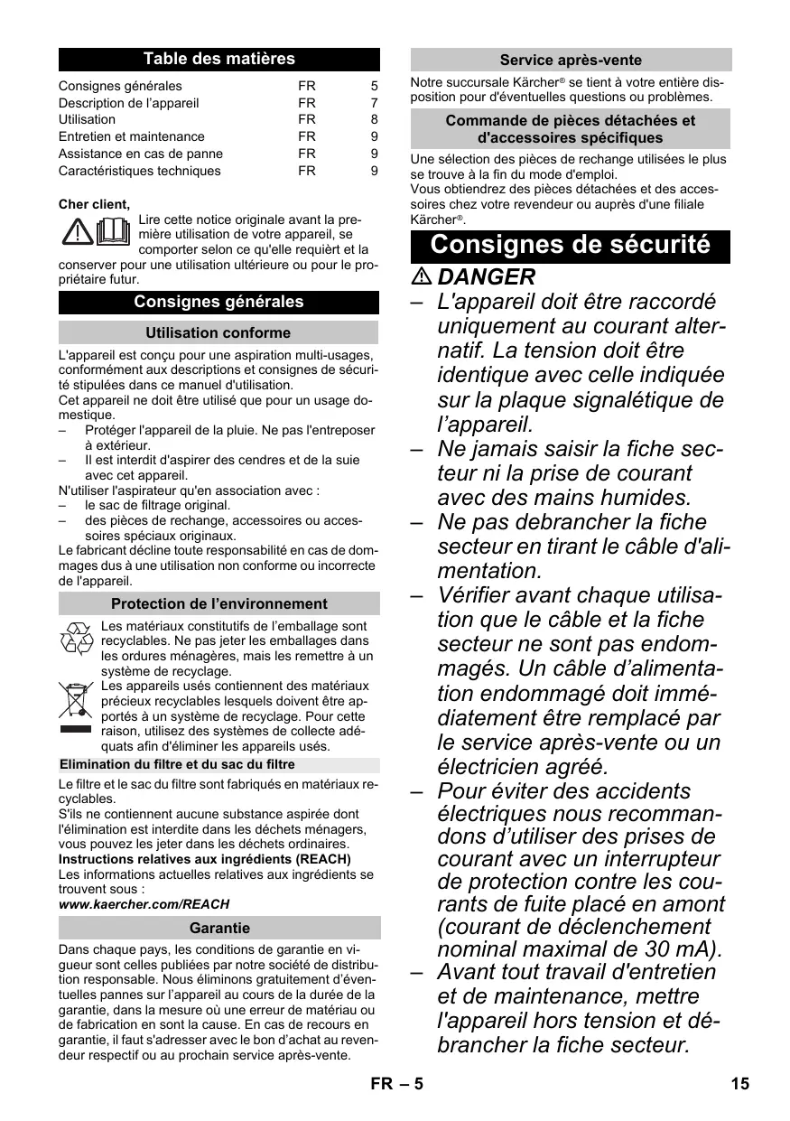 Cher client, Lire cette notice originale avant la première utilisation de votre appareil, se comporter selon ce qu'elle requièrt et la conserver pour une utilisation ultérieure ou pour le propriétaire futur. Consignes générales Utilisation conforme L'appareil est conçu pour une aspiration multi-usages, conformément aux descriptions et consignes de sécurité stipulées dans ce manuel d'utilisation. Cet appareil ne doit être utilisé que pour un usage domestique. – Protéger l'appareil de la pluie. Ne pas l'entreposer à extérieur. – Il est interdit d'aspirer des cendres et de la suie avec cet appareil. N'utiliser l'aspirateur qu'en association avec : – le sac de filtrage original. – des pièces de rechange, accessoires ou accessoires spéciaux originaux. Le fabricant décline toute responsabilité en cas de dommages dus à une utilisation non conforme ou incorrecte de l'appareil. Protection de l’environnement Les matériaux constitutifs de l’emballage sont recyclables. Ne pas jeter les emballages dans les ordures ménagères, mais les remettre à un système de recyclage. Les appareils usés contiennent des matériaux précieux recyclables lesquels doivent être apportés à un système de recyclage. Pour cette raison, utilisez des systèmes de collecte adéquats afin d'éliminer les appareils usés. Elimination du filtre et du sac du filtre Le filtre et le sac du filtre sont fabriqués en matériaux recyclables. S'ils ne contiennent aucune substance aspirée dont l'élimination est interdite dans les déchets ménagers, vous pouvez les jeter dans les déchets ordinaires. Instructions relatives aux ingrédients (REACH) Les informations actuelles relatives aux ingrédients se trouvent sous : www.kaercher.com/REACH Garantie Dans chaque pays, les conditions de garantie en vigueur sont celles publiées par notre société de distribution responsable. Nous éliminons gratuitement d’éventuelles pannes sur l’appareil au cours de la durée de la garantie, dans la mesure où une erreur de matériau ou de fabrication en sont la cause. En cas de recours en garantie, il faut s'adresser avec le bon d’achat au revendeur respectif ou au prochain service après-vente. Notre succursale Kärcher ® se tient à votre entière disposition pour d'éventuelles questions ou problèmes. Commande de pièces détachées et d'accessoires spécifiques Une sélection des pièces de rechange utilisées le plus se trouve à la fin du mode d'emploi. Vous obtiendrez des pièces détachées et des accessoires chez votre revendeur ou auprès d'une filiale Kärcher ®. Consignes de sécurité DANGER – L'appareil doit être raccordé uniquement au courant alternatif. La tension doit être identique avec celle indiquée sur la plaque signalétique de l’appareil. – Ne jamais saisir la fiche secteur ni la prise de courant avec des mains humides. – Ne pas debrancher la fiche secteur en tirant le câble d'alimentation. – Vérifier avant chaque utilisation que le câble et la fiche secteur ne sont pas endommagés. Un câble d’alimentation endommagé doit immédiatement être remplacé par le service après-vente ou un électricien agréé. – Pour éviter des accidents électriques nous recommandons d’utiliser des prises de courant avec un interrupteur de protection contre les courants de fuite placé en amont (courant de déclenchement nominal maximal de 30 mA). – Avant tout travail d'entretien et de maintenance, mettre l'appareil hors tension et débrancher la fiche secteur. FR – 5