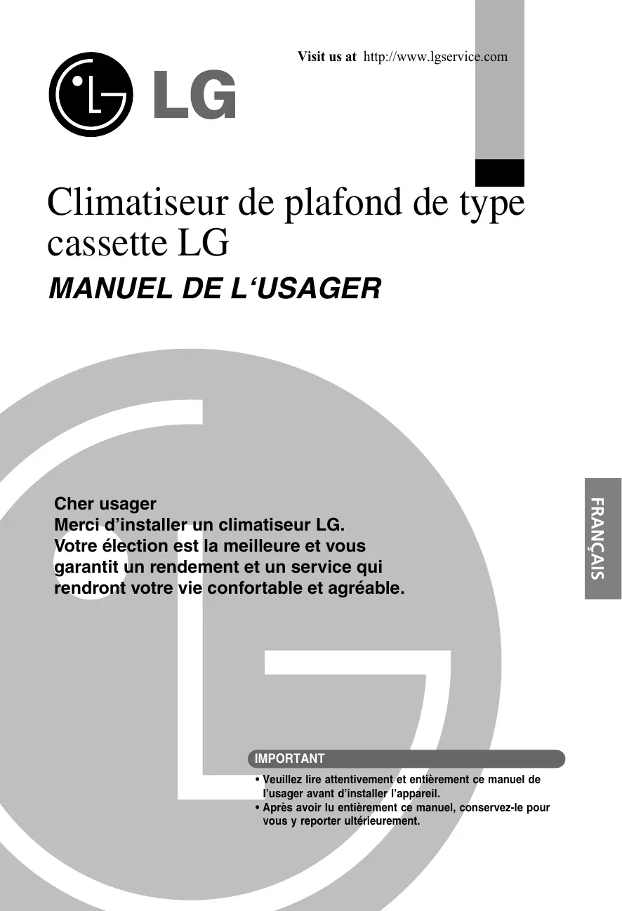 Cher usager Merci d'installer un climatiseur LG. Votre élection est la meilleure et vous garantit un rendement et un service qui rendront votre vie confortable et agréable. SIVÈNVE IMPORTANT + Veuillez lire attentivement et entièrement ce manuel de l'usager avant d'installer l'appareil. #Après avoir lu entièrement ce manuel, conservez-le pour vous y reporter ultérieurement.