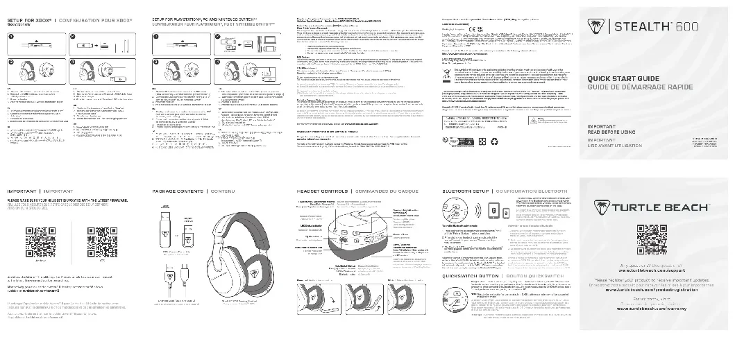 II pour Windows, disponible sur turtlebeach.com/swarm2 Stealth™ 600 Gaming Headset Casque de jeu Stealth™ 600 USB Wireless Transmitter Xbox versionPS/PC versionRécepteur USB sans-filCharging Cable (USB-A to USB-C)Câble de chargement (USB-A vers USB-C)