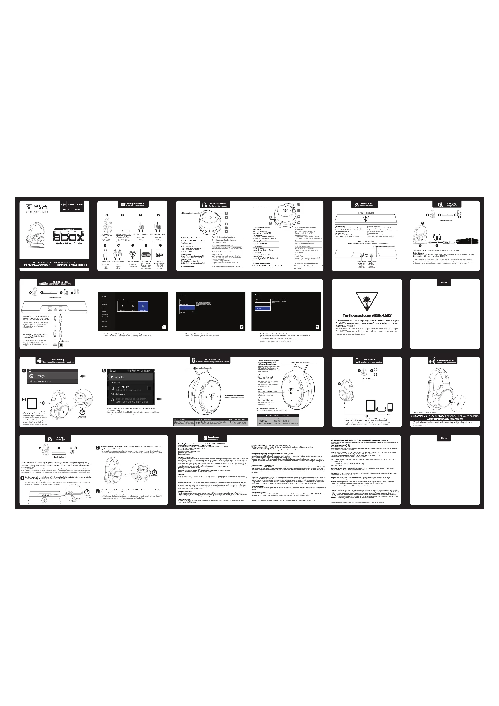 Required / RequiseRequired / RequiseSearch for Turtle Beach Elite 800X in your mobile device's Bluetooth device list and complete pairingCherchez le casque Turle Beach Elite 800X dans la liste des appareils qui s'affiche sur votre appareil mobile et finalisez le jumelage.Left Earcup / Écouteur gaucheThe Elite 800X functions adapt for your convenience when used solely with a Bluetooth device.Les fonctionnalités du casque Elite 800X s'adaptent parfaitement à une utilisation en Bluetooth sur un appareil mobile.Bluetooth Multifunction ButtonShort Press = Cycle EQ PresetsShort Press = Play/PauseAppuyez brièvement pour lire/mettre en pauseAppuyez brièvement pour parcourir les presets d'égalisationPresetShort Press = Next TrackLong Press = Last TrackAppuyez brièvement pour passer au morceau suivantAppuyez longuement pour passer au dernier morceauBouton Bluetooth multifonctionRight Earcup / écouteur droit*Functionality may vary by device*Les fonctionnalités varient en fonction de l'appareil. Wired Setup Branchement des câbles Notes
