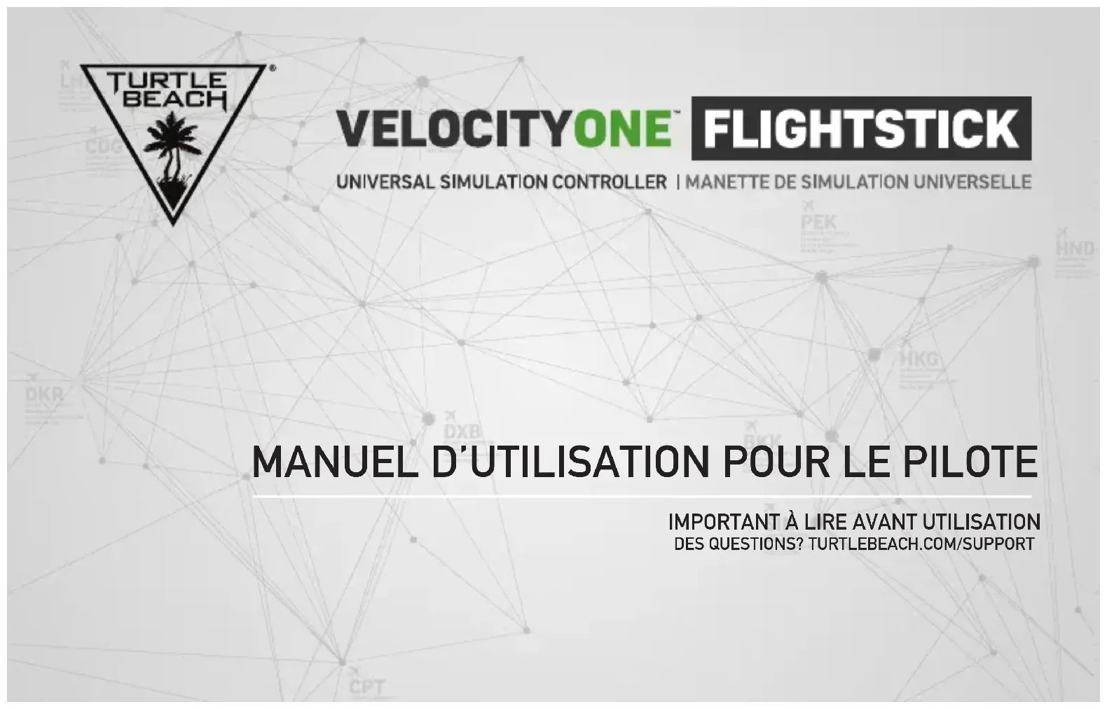 - BOUTONS NUMÉRIQUES - La molette permettra d’utiliser deux pressions de bouton selon la direction où elle est déplacée. Idéal pour les avions contrôlant le compensateur via bouton. AGV - ROULETTE DU COMPENSATEURLe blocage de la gouverne de direction permet d’empêcher les actions provenant des rotations du manche. Cette option peut par exemple servir lorsqu’aucun contrôle de mouvement de lacet n’est requis ou lorsque le manche est utilisé conjointement à un palonnier. AGV - BLOCAGE DE LA GOUVERNE DE DIRECTIONExistant déjà sur notre gamme de manettes pour console, la fonctionnalité Pro Aim intégrée permet de réduire temporairement la sensibilité des axes du manche principal. Cette option s’avère utile pour effectuer des ajustements critiques en plein vol ou pour cibler plus efficacement votre ennemi. L’option Configurer les boutons permet de configurer tous les boutons programmables afin d’utiliser la fonctionnalité Pro Aim. Il faut ensuite maintenir appuyé le bouton assigné. Veuillez noter que toute fonctionnalité préalablement assignée au bouton sera utilisée en même temps que Pro Aim. L’option Configurer les niveaux permet de régler la réduction de la sensibilité lorsque vous appuyez sur le bouton assigné à Pro Aim. Plus le niveau est élevé, plus la réduction de la sensibilité est importante. AGV - PRO AIMAlliée au repose-poignet réglable, la fonctionnalité Orientation permet d’optimiser l’expérience du Flightstick, que vous soyez gaucher ou droitier. Par défaut, le produit est configuré pour les droitiers. Lorsque le produit est configuré pour les gauchers, l’assignation des boutons et axes des contrôles de base s’inverse. Vous pouvez donc utiliser le manche avec votre main gauche, tout en disposant toujours d’un accès facile aux contrôles ABXY et aux commandes des manettes de gaz primaires avec votre main droite. Vous évitez ainsi les mouvements de mains inconfortables et les réglages de profil chronophages. Une fois votre préférence sélectionnée, elle s’affichera sur l’écran d’accueil afin d’être facilement consultable. AGV - ORIENTATIONRéglez la sensibilité globale du pavé tactile. Les options vont de faible à élevée, la valeur maximale correspondant à un mouvement extrêmement rapide et la valeur minimale correspondant à une absence de mouvement. AGV - SENSIBILITÉ DU PAVÉ TACTILEPersonnalisez l’apparence du produit en faisant votre choix parmi plusieurs thèmes de couleurs. Vous pouvez également ajuster la luminosité des LED et de l’AGV selon vos préférences. AGV - ÉCLAIRAGEReliez le Flightstick à un appareil intelligent compatible via Bluetooth et utilisez l’application associée afin de bénéficier de la personnalisation en temps réel des fonctionnalités du produit. L’application associée sur appareil intelligent requiert Android 8.0, iOS 15.4 ou version ultérieure. AGV - BLUETOOTHLe produit comporte deux ports USB-C supplémentaires situés près du port de connexion principal. Il s’agit de ports d’extension qui seront ultérieurement utilisables par les périphériques VelocityOne. Actuellement, il n’existe aucun produit complémentaire utilisant ces ports. Lorsqu’ils seront disponibles, une mise à jour du micrologiciel du produit sera effectuée afin de pouvoir l’utiliser avec d’autres accessoires de notre gamme. PORTS D’EXTENSIONVous n’avez pas trouvé ce que vous cherchiez? Rendez-vous sur turtlebeach.com/support pour consulter les dernières informations de l’assistance technique. Recherchez l’application associée Velocityone Flightstick sur le Microsoft Store, le Google Play Store et l’App Store. L’application compagnon pour appareil intelligent nécessite Android 8.0, iOS 15.4 ou version ultérieure.Regulatory Compliance Statements for the Velocityone Flightstick Local Restrictions on Radio Usage Caution: Due to the fact that the frequencies used by wireless devices may not yet be harmonized in all countries, these radio products are designed for use only in specic countries, and are not allowed to be operated in countries other than those of designated use. As a user of these products, you are responsible for ensuring that the products are used only in the countries for which they were intended and for verifying that they are congured with the correct selection of frequency and channel for the country of use. Any deviation from the permissible power and frequency settings for the country of use is an infringement of national law and may be punished as such. To determine whether you are allowed to use your wireless network device in a specic country, please check to see if the radio type number that is printed on the identication label of your device is listed in the manufacturer’s OEM Regulatory Guidance document at the following URL http://www.turtlebeach.com/ homologation or contact Turtle Beach directly. Federal Communications Commission (FCC) Compliance Notices This section includes the following FCC statements for the Velocityone Flightstick: