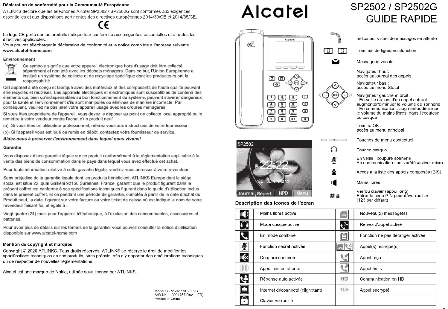 GUIDE RAPIDE Mains libres activé Mode casque activé En mode combiné Fonction secret activée Coupure sonnerie Appel mis en attente Réponse auto activée Internet déconnecté (clignotant) Nouveau(x) message(s) Renvoi d'appel activé Fonction ne pas déranger activée Appel(s) manqué(s) Appel reçu Appel émis Communication en HD Appel encrypté Clavier verrouillé Model : SP2502 / SP2502G A/W No.: 10001757 Rev.1 (FR) Printed in China Déclaration de conformité pour la Communauté Européenne Alcatel est une marque de Nokia, utilisée sous licence par ATLINKS.