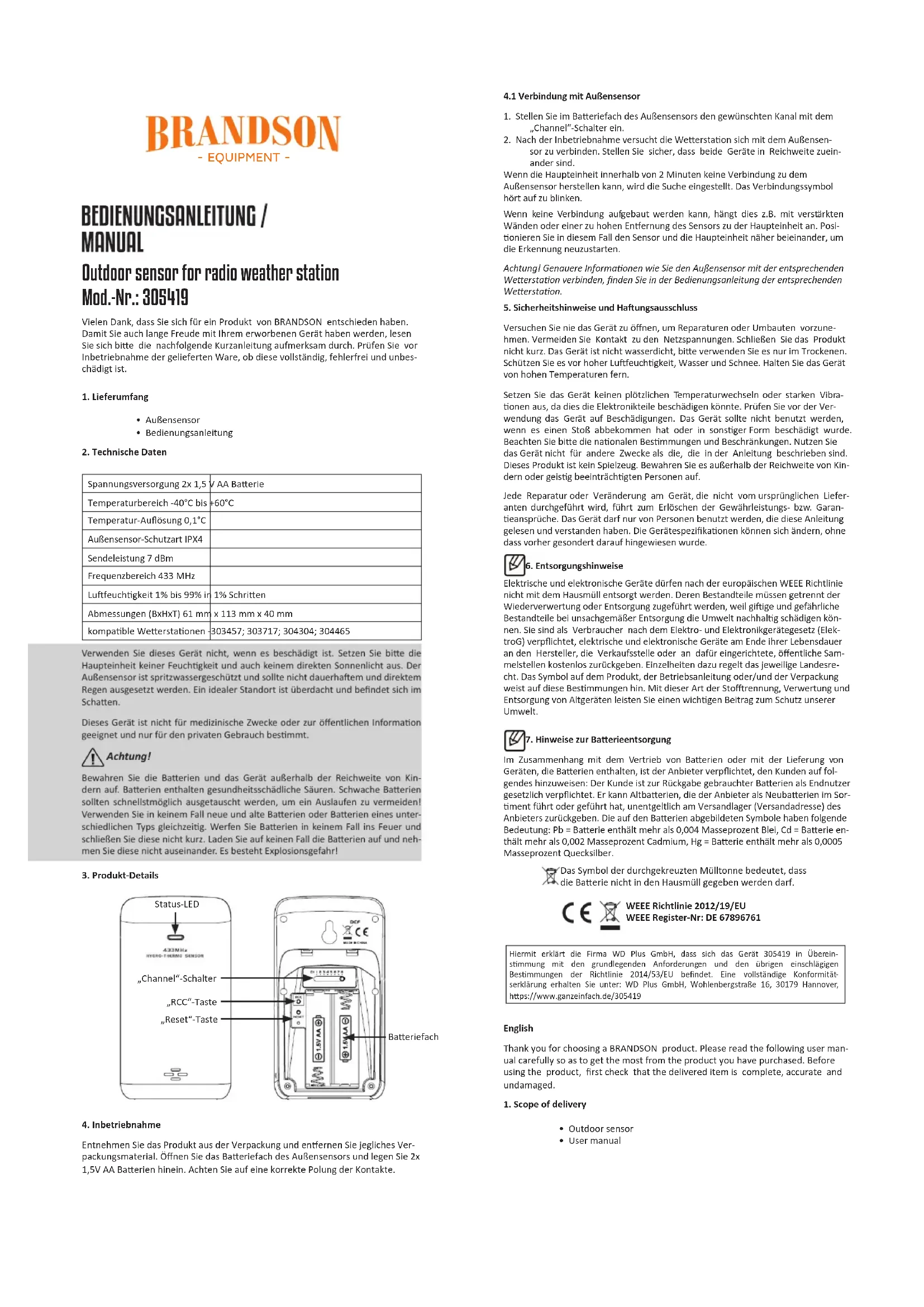 N’ulisez pas cet appareil s’il est endommagé. N’exposez pas l’unité principale à l’humidité ou à la lumière solaire directe. Le capteur extérieur est protégé contre les éclaboussures, mais il ne doit pas être exposé de façon durable et directe à la pluie. Un emplacement idéal, c’est sous abri et à l’ombre. Cet appareil n’est pas approprié pour des ns médicales ou pour des informaons publiques et il est prévu uniquement pour l’usage privé. Aenon! Conservez les baeries et l’appareil hors de la portée des enfants. Les baeries conennent des acides nocifs pour la santé. Des baeries faibles devraient être remplacées le plus vite possible, an d’éviter des fuites ! N’ulisez en aucun cas simultanément des baeries nouvelles et anciennes ou des baeries de types dif- férents. Ne jetez en aucun cas des baeries au feu et ne les court-circuitez pas. Ne rechargez en aucun cas les baeries et ne les désassemblez pas. Il y a un risque d’explosion ! Alimentaon en tension 2 baeries AA 1,5 V Plage de température -40°C à +60°C Résoluon de la tempéra- ture 0,1°C Classe de protecon du capteur extérieur IPX4 Puissance d'émission 7 dBm Plage de fréquence 433 MHz Hygrométrie 1% à 99% en intervalles de 1% Dimensions (LxHxP) 61 mm x 113 mm x 40 mm staons météorologiques compables 303457 ; 303717 ; 304304; 304465 LED d'état Commutateur « Channel » Compar- ment à piles Touche « Reset » Touche « RCC »