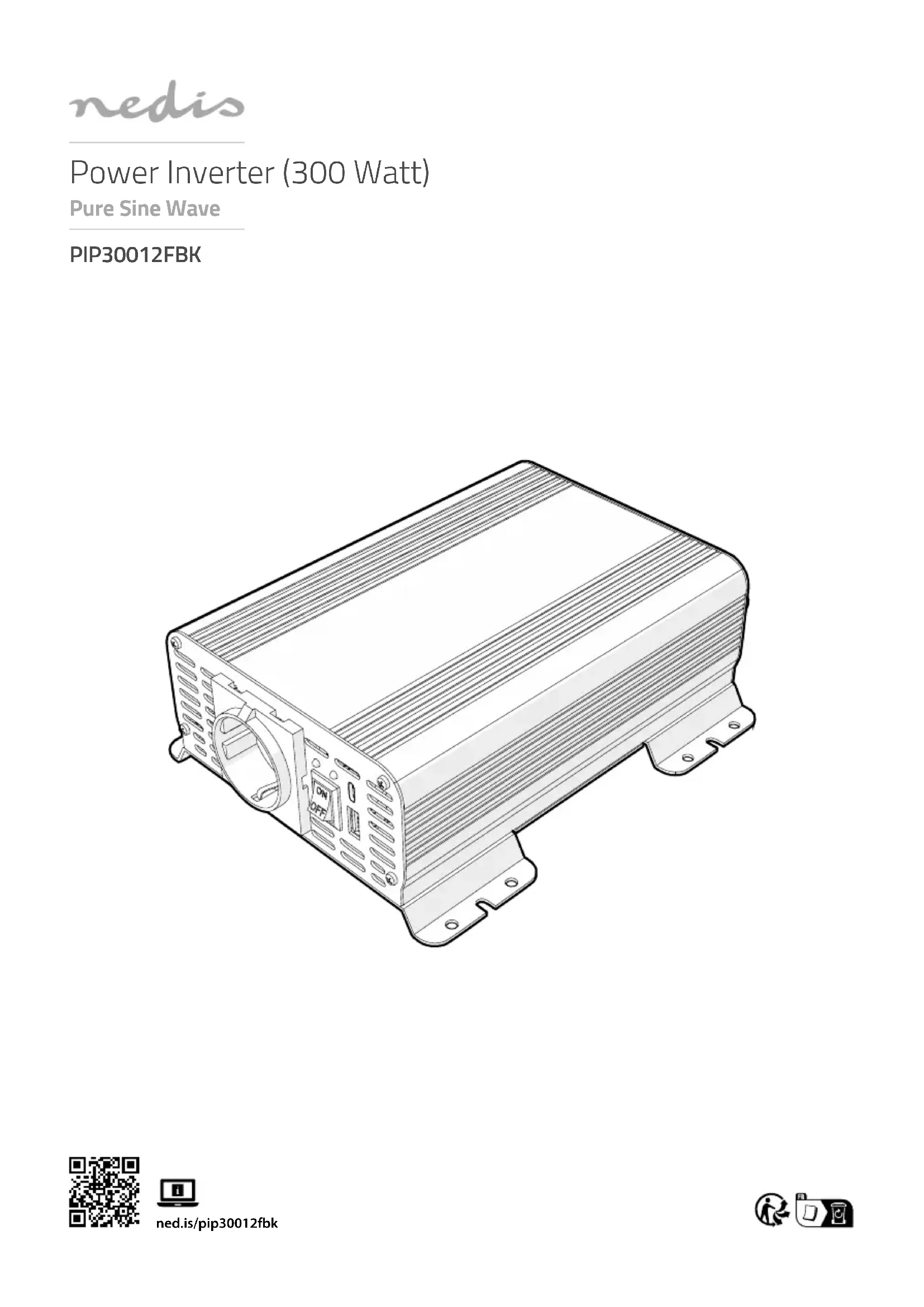 Guide de démarrage rapide Onduleur de puissance (300 Watt) PIP30012FBKPour plus d'informations, consultez le manuel détaillé en ligne : ned.is/pip30012fbk Utilisation prévue Ce produit est un convertisseur de puissance qui permet de convertir 12 V DC en 230 V AC.N'utilisez ce produit qu'en combinaison avec des appareils de classe II. Ne pas utiliser ce produit avec :• Appareils dépassant la puissance nominale de l'onduleur.• Les appareils à charge capacitive et perceptive tels que les climatiseurs, les perceuses à haute puissance, les réfrigérateurs, les fours à micro-ondes ou les mixeurs.• Appareils ayant des exigences strictes en matière d'alimentation électrique, tels que les appareils de mesure de précision.Le produit est prévu pour un usage intérieur uniquement.Toute modication du produit peut avoir des conséquences sur la sécurité, la garantie et le bon fonctionnement.Le produit n’est pas destiné à un usage professionnel. Pièces principales (image A) 1 Onduleur de puissance2 Câbles d'alimentation Pièces principales (image B) 1 Borne de câble +2 Borne de câble -3 Sol4 Prise d’alimentation5 Indicateur d'alimentation LED 6 Interrupteur7 Indicateur de défaut LED8 Port USB9 Port USB-C Consignes de sécurité