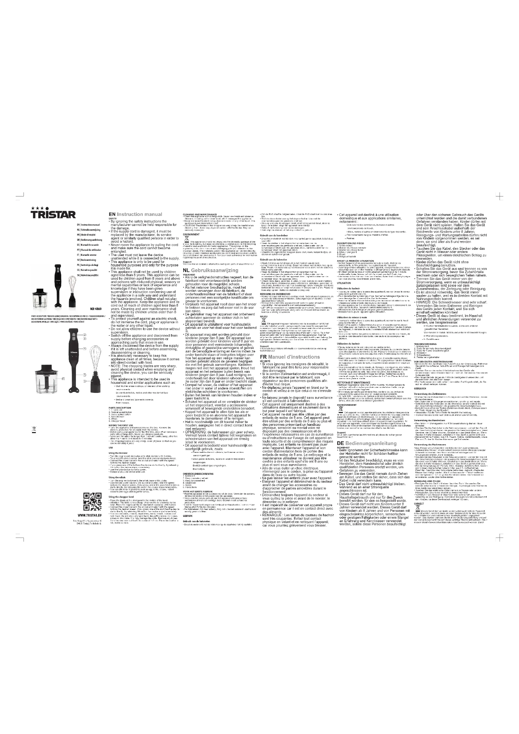 - Cet appareil est destiné à une utilisation domestique et aux applications similaires, notamment: – Coin cuisine des commerces, bureaux et autresenvironnements de travail.– Hôtels, motels et autres environnements de type résidentiel.– Environnements de type chambre d’hôtes.– Fermes.DESCRIPTION DES PIÈCES1. Unité moteur2. Bouton de vitesse normale3. Bouton de vitesse turbo4. Mixeur plongeant5. Fouet6. Bol pour hachoirAVANT LA PREMIÈRE UTILISATION• Sortez l'appareil et les accessoires hors de la boîte.Retirez lesautocollants, le film protecteur ou le plastique de l'appareil.• Avant la première utilisation de votre appareil, essuyez toutes les piècesamovibles avec un chiffon humide. N’utilisez jamais de produits abrasifs.• N'utilisez jamais le mixeur continuellement pendant plus de 1 minute.Après cette durée, laissez refroidir le mixeur pendant 5 minutes.• Les lames du hachoir sont très tranchantes, évitez tout contact physiquecar vous pourriez vous blesser gravement.UTILISATIONUtilisation du hachoir• Tournez le moteur dans le sens des aiguilles d'une montre sur le mixeurjusqu'à ce qu'il s'enclenche.• Pour déverrouiller le mélangeur tige, tournez le mélangeur tige dans lesens des aiguilles d'une montre pour le desserrer.• Branchez le câble d'alimentation à la prise de courant et sélectionnez lavitesse souhaitée à l'aide des boutons de vitesse.• Si vous appuyez sur l'un des boutons, l'appareil démarre directement, enrelâchant le bouton, l'appareil s'arrête immédiatement.• Utilisez le bouton turbo pour une plus grande puissance.• Débranchez toujours l'appareil après utilisation.Utilisation du mixeur à main• Tournez le moteur dans le sens des aiguilles d'une montre sur le fouetjusqu'à entendre un clic.• Branchez le cordon d’alimentation à la prise et sélectionnez la vitessesouhaitée avec les boutons de vitesse. En appuyant sur l’un des boutonsde l’appareil, il démarre de suite, il s’arrête immédiatement en relâchantle bouton.• Vous pouvez battre des petits ingrédients comme des blancs d’œufs, dela crème, des desserts instantanés, des œufs et du sucre pour lesgâteaux.Utilisation du hachoir• Placez la lame sur le point de pivot au centre du bol.• Attention! Les lames sont très coupantes. Dévissez le couvercle dans lesens des aiguilles d'une montre du bol. Placez le moteur sur le couvercleet tournez-le dans le sens des aiguilles d'une montre jusqu'à entendre unclic.• Branchez le cordon d’alimentation à la prise et sélectionnez la vitessesouhaitée avec les boutons de vitesse. En appuyant sur l’un des boutonsde l’appareil, il démarre de suite, il s’arrête immédiatement en relâchantle bouton.• Vous pouvez utiliser de la viande, du fromage, des légumes, des herbes,du pain, des biscuits et des noix. Ne découpez pas de nourriture durecomme des grains de café, des cubes de glace, des épices ou duchocolat, cela pourrait endommager les lames. Retirez les os de laviande et coupez la nourriture en cubes de 1 à 2 cm. Placez le bol surune surface plate et stable.NETTOYAGE ET MAINTENANCE• Nettoyez l'appareil à l'aide d'un chiffon humide. N'utilisez jamais denettoyant abrasif ni de tampon à récurer ou de laine d'acier, ce quipourrait endommager l'appareil.• N'immergez jamais l'appareil dans l'eau ou dans tout autre liquide.L'appareil n'est pas prévu pour un lavage au lave-vaisselle.• ATTENTION ! Les lames du hachoir sont très tranchantes, faitesattention lorsque vous les nettoyez. Évitez tout contact physique avec leslames, elles peuvent vous blesser gravement.ENVIRONNEMENTCet appareil ne doit pas être jeté avec les déchets ménagers à lafin de sa durée de vie, il doit être remis à un centre de recyclage pour lesappareils électriques et électroniques. Ce symbole sur l'appareil, lemanuel d'utilisation et l'emballage attire votre attention sur un pointimportant. Les matériaux utilisés dans cet appareil sont recyclables. Enrecyclant vos appareils, vous contribuez de manière significative à laprotection de notre environnement. Renseignez-vous auprès des autoritéslocales pour connaître les centres de collecte des déchets.SupportVous retrouvez toutes les informations et pièces de rechange surwww.tristar.eu! DEBedienungsanleitung SICHERHEIT