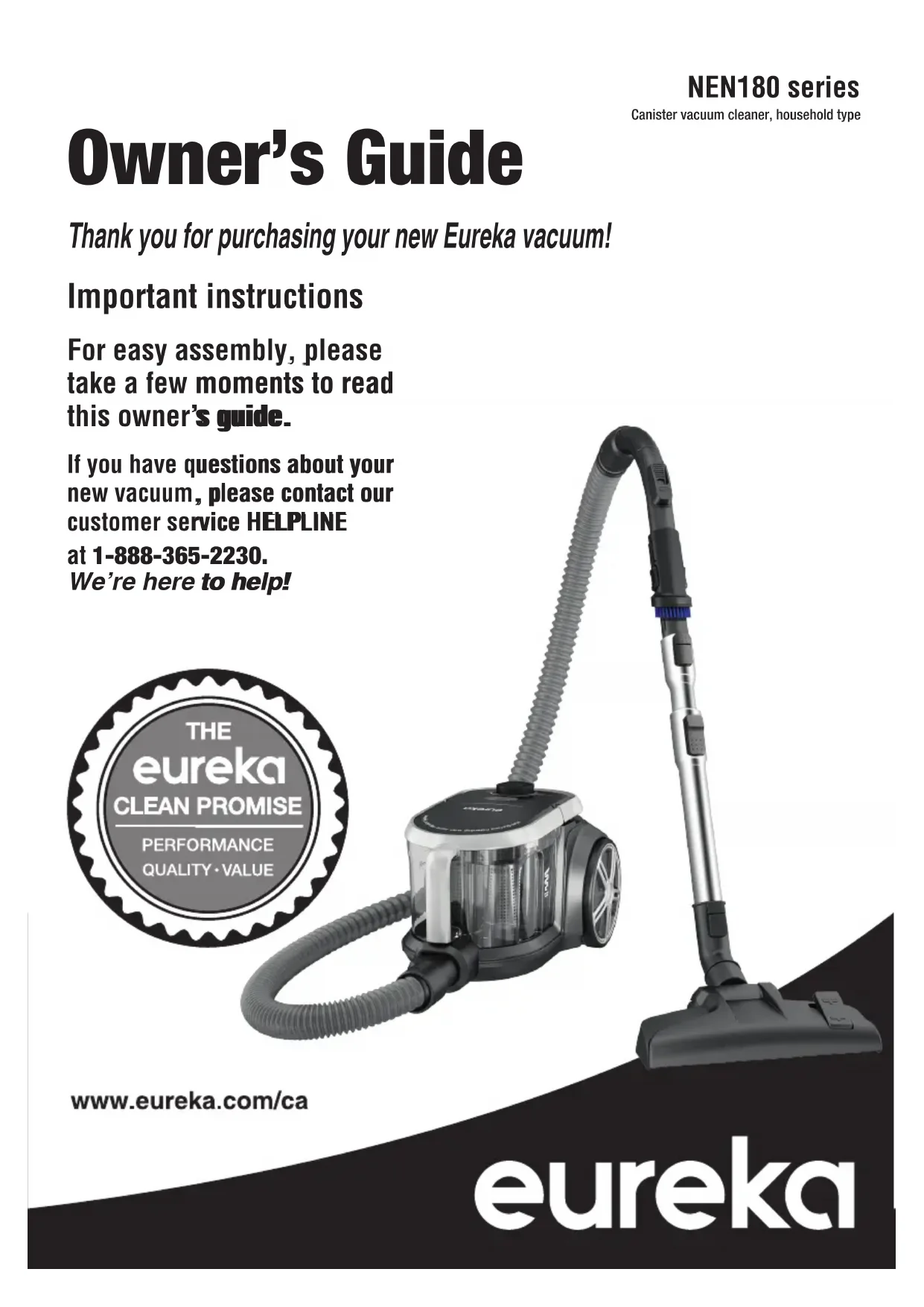 !Série NEN180 Aspirateur traîneau, type domestique Guide d’utilisateur Merci d'avoir acheté votre nouvel aspirateur Eureka ! Instructions importantes Pour faciliter l'assemblage, veuillez prendre quelques instants pour lire ce guide d'utilisateur. Si vous avez des questions concernant votre nouvel aspirateur, veuillez contacter notre LIGNE D'ASSISTANCE TÉLÉPHONIQUE du service clientèle au 1-888-365-2230. Nous sommes là pour vous aider !LIGNE D'ASSISTANCE TÉLÉPHONIQUE du service clientèle d'Eureka : 1-888-365-2230