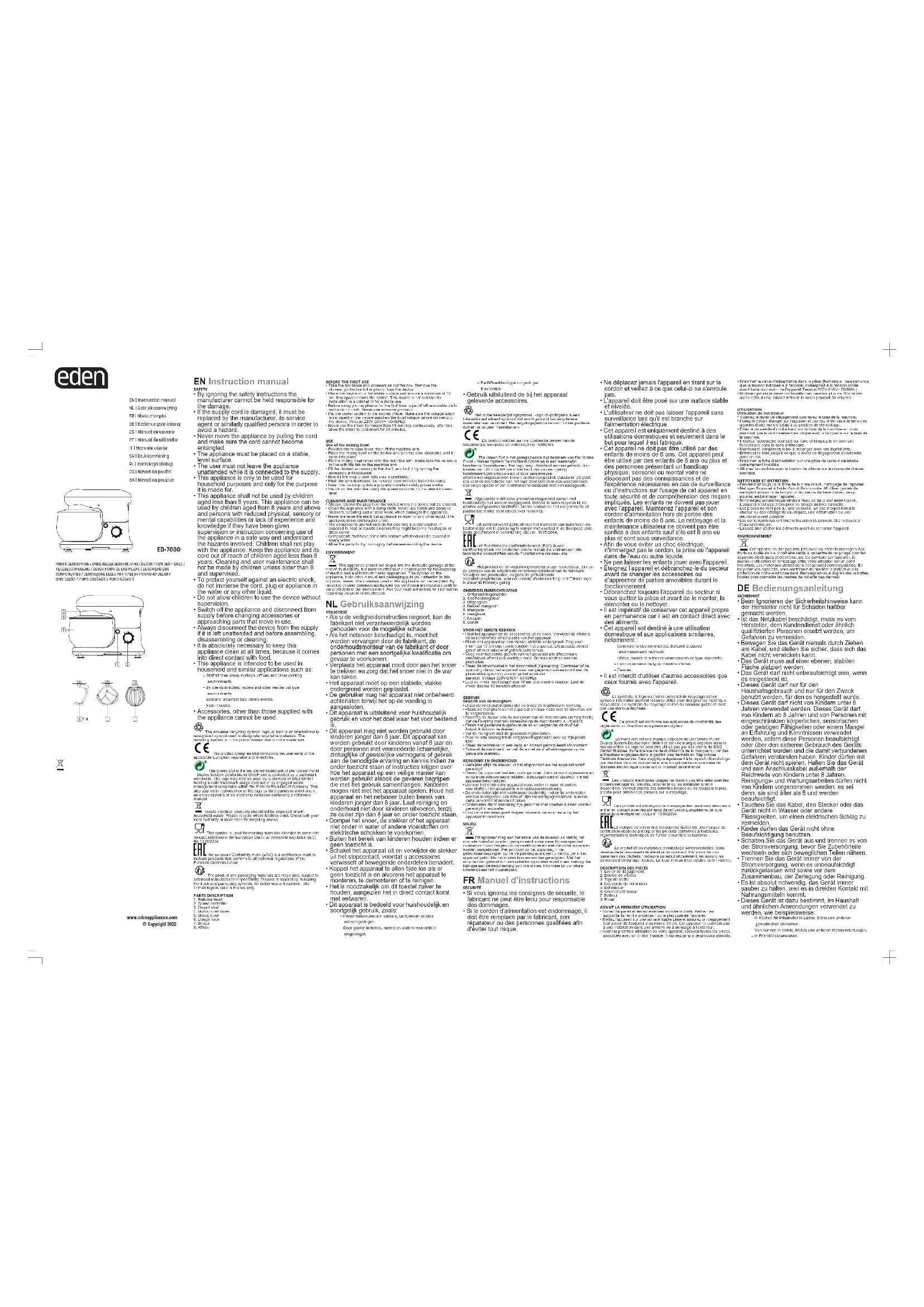 - Il est interdit d'utiliser d'autres accessoires que ceux fournis avec l'appareil. Le symbole, le logo ou l'icône universel de recyclage est unsymbole internationalement reconnu utilisé pour désigner les matériauxrecyclables. Le symbole du recyclage relève du domaine public et n'estpas une marque déposée. Ce produit est conforme aux exigences de conformité desrèglements ou directives européens en vigueur. Le Point vert est une marque déposée de Der Grüne Punkt -Duales System Deutschland GmbH et est une marque déposée dans lemonde entier. Le logo ne peut être utilisé que par des clients de DSDGmbH titulaires d'une licence valide d'utilisation de la marque ou par desentreprises engagées dans la gestion des déchets en RépubliqueFédérale Allemande. Cela s'applique également à la reproduction du logopar des tiers dans un dictionnaire, une encyclopédie ou une base dedonnées électronique contenant un manuel de référence. Les produits électriques usagés ne doivent pas être jetés avec lesordures ménagères. Veuillez recycler là où les installations sontdisponibles. Vérifiez auprès des autorités locales ou du magasin le plusproche pour obtenir des conseils sur le recyclage. Ce symbole est utilisé pour le marquage des matériaux destinés àentrer en contact avec les aliments dans l'Union Européenne, tel quedéfini dans le règlement (CE) n° 1935/2004. La marque de conformité eurasienne (ЕАС) est une marque decertification destinée à indiquer les produits conformes à toutes lesréglementations techniques de l'Union douanière eurasienne. Le produit et les matériaux d'emballage sont recyclables, sousréserve de la responsabilité étendue du fabricant. Par souci de bontraitement des déchets, mettez-le au rebut séparément, en suivant lessymboles d'emballage illustrés. Le logo Triman n'est valable qu'en France.DESCRIPTION DES PIÈCES1. Levier de dégagement2. Bouton de vitesse3. Tige de sortie4. Couvercle de bol mixeur5. Bol mixeur6. Crochet pétrisseur7. Batteur8. FouetAVANT LA PREMIÈRE UTILISATION• Sortez l'appareil et les accessoires hors de la boîte.Retirez lesautocollants, le film protecteur ou le plastique de l'appareil.• Mettez l'appareil sur une surface stable plate et assurez un dégagementtout autour de l'appareil d'au moins 10 cm. Cet appareil ne convient pasà une installation dans une armoire ou à un usage à l'extérieur.• Avant la première utilisation de votre appareil, essuyez toutes les piècesamovibles avec un chiffon humide. N’utilisez jamais de produits abrasifs.• Branchez le câble d'alimentation dans la prise.(Remarque : assurez-vousque la tension indiquée sur l'appareil correspond à la tension localeavant toute connexion de l'appareil.Tension220V-240V~ 50/60Hz).• N'utilisez jamais le mixer continuellement pendant plus de 10 minutes,après cette durée, laissez refroidir le mixer pendant 30 minutes.UTILISATIONUtilisation du bol mixeur• Tournez le levier de dégagement puis levez le bras de la machine.• Posez le bol à mélanger sur l’appareil et tournez le bol dans le sens desaiguilles d’une montre jusqu’à sa position de verrouillage.• Fixez le couvercle du bol mixeur sur le bras de la machine en vousassurant que le renfoncement est aligné avec la languette sur le bras dela machine.• Installez l'accessoire souhaité sur l'axe et bloquez-le en tournantl'accessoire dans le sens antihoraire.• Maintenant, remplissez le bol à mélanger avec vos ingrédients.• Enfoncez le bras jusqu'à ce que le levier de dégagement s'enclencheavec un clic.• Branchez la fiche d’alimentation sur une prise de secteur sécuriséecorrectement installée.• Allumez la machine avec le bouton de vitesse sur le niveau de vitessesouhaité.NETTOYAGE ET ENTRETIEN• Débranchez toujours la fiche de la prise lors du nettoyage de l'appareil.• Nettoyez l'appareil à l'aide d'un chiffon humide. N'utilisez jamais denettoyant abrasif ni de tampon à récurer ou de laine d'acier, ce quipourrait endommager l'appareil.• N'immergez jamais l'appareil dans l'eau ou dans tout autre liquide.L'appareil n'est pas prévu pour un lavage au lave-vaisselle.• Les pièces ne vont pas au lave-vaisselle. En cas d'exposition à lachaleur ou des détergents caustiques, une déformation ou unedécoloration est possible.• Les composants qui ont touché les aliments peuvent être nettoyés àl’eau savonneuse.• Laissez bien sécher les éléments avant de remonter l’appareil.ENVIRONNEMENTCet appareil ne doit pas être jeté avec les déchets ménagers à lafin de sa durée de vie, il doit être remis à un centre de recyclage pour lesappareils électriques et électroniques. Ce symbole sur l'appareil, lemanuel d'utilisation et l'emballage attire votre attention sur un pointimportant. Les matériaux utilisés dans cet appareil sont recyclables. Enrecyclant vos appareils, vous contribuez de manière significative à laprotection de notre environnement. Renseignez-vous auprès des autoritéslocales pour connaître les centres de collecte des déchets. DEBedienungsanleitung SICHERHEIT