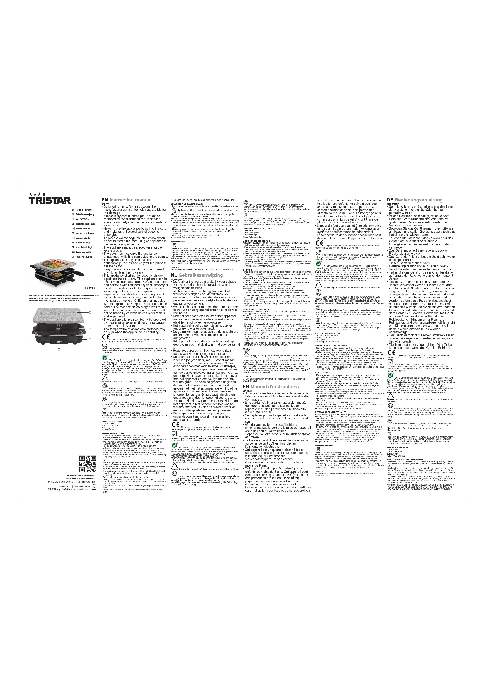 - La température des surfaces accessibles peut devenir élevée quand l'appareil est en fonction. Ce produit est conforme aux exigences de conformité desrèglements ou directives européens en vigueur. Ce symbole est utilisé pour le marquage des matériaux destinés àentrer en contact avec les aliments dans l'Union Européenne, tel quedéfini dans le règlement (CE) n° 1935/2004. Le Point vert est une marque déposée de Der Grüne Punkt -Duales System Deutschland GmbH et est une marque déposée dans lemonde entier. Le logo ne peut être utilisé que par des clients de DSDGmbH titulaires d'une licence valide d'utilisation de la marque ou par desentreprises engagées dans la gestion des déchets en RépubliqueFédérale Allemande. Cela s'applique également à la reproduction du logopar des tiers dans un dictionnaire, une encyclopédie ou une base dedonnées électronique contenant un manuel de référence. Collecte séparée / Vérifiez les directives de votre municipalitélocale. Le produit et les matériaux d'emballage sont recyclables, sousréserve de la responsabilité étendue du fabricant. Par souci de bontraitement des déchets, mettez-le au rebut séparément, en suivant lessymboles d'emballage illustrés. Le logo Triman n'est valable qu'en France. Le symbole, le logo ou l'icône universel de recyclage est unsymbole internationalement reconnu utilisé pour désigner les matériauxrecyclables. Le symbole du recyclage relève du domaine public et n'estpas une marque déposée. Les produits électriques usagés ne doivent pas être jetés avec lesordures ménagères. Veuillez recycler là où les installations sontdisponibles. Vérifiez auprès des autorités locales ou du magasin le plusproche pour obtenir des conseils sur le recyclage.DESCRIPTION DES PIÈCES1. Cordon d’alimentation2. Pierre à cuire3. Coupelle4. Interrupteur marche/arrêtAVANT LA PREMIÈRE UTILISATION• Sortez l'appareil et les accessoires hors de la boîte.Retirez lesautocollants, le film protecteur ou le plastique de l'appareil.• Mettez l'appareil sur une surface stable plate et assurez un dégagementtout autour de l'appareil d'au moins 10 cm. Cet appareil ne convient pasà une installation dans une armoire ou à un usage à l'extérieur.• Branchez le câble d'alimentation dans la prise.(Remarque : assurez-vousque la tension indiquée sur l'appareil correspond à la tension localeavant toute connexion de l'appareil.Tension220V-240V~ 50/60Hz).• Lorsque l'appareil est allumé pour la première fois, une légère odeur sedégage. Ceci est normal et gage d'une ventilation adéquate. Cette odeurest temporaire et disparaîtra vite.UTILISATION• Placez la plaque sur le support, avec le côté brillant vers le haut. Nemettez jamais la plaque froide sur un appareil préchauffé.• Ne mettez jamais une feuille d'aluminium ni quoi que ce soit entre laplaque et l'élément chauffant.• Il est conseillé de huiler légèrement la pierre à cuire avec de l'huilevégétale et de la saupoudrer d'un peu de sel après préchauffage afind'éviter les incrustations.• Ne mettez jamais d'ingrédients congelés sur la plaque chaude.• Pendant le chauffage, la plaque produira peut-être de petitscraquements, car la pierre s'étend naturellement. Cela n'a pas d'effet surle fonctionnement de l'appareil.• Au bout de quelques utilisations, la pierre prendra une couleur sombredéfinitive.• Ne jamais mettre une coupelle vide sous la plaque chauffante.• Les coupelles peuvent aussi être utilisées pour la cuisson des viandes àcondition qu'elles soient finement découpées.• Laissez l'appareil préchauffer environ 20 minutes.NETTOYAGE ET MAINTENANCE• Avant le nettoyage, débranchez l'appareil et attendez qu'il refroidisse.• Essuyez l'intérieur et les bords de l'appareil avec une serviette en papierou un chiffon doux.• Ne nettoyez pas l'intérieur ou l'extérieur avec des éponges à récurerabrasives ou en laine d'acier car la surface serait endommagée.• Ne jamais immerger l’appareil dans l’eau ou tout autre liquide.• La pierre à cuire est une pierre naturelle. Chaque pierre est unique, elleabsorbe plus ou moins d'eau selon sa porosité. Une pierre immergéedans l'eau peut se briser en chauffant lors de l'utilisation suivante.• N'immergez jamais la pierre dans l'eau, qu'elle soit chaude ou froide.Lavez la pierre après qu'elle ait complètement refroidi à l'eau tiède etnettoyez-la avec une éponge abrasive. Séchez soigneusement.• Évitez d'utiliser des détergents et d'autres produits nettoyants.• La plaque de la pierre à cuire ne va pas au lave-vaisselle.ENVIRONNEMENTCet appareil ne doit pas être jeté avec les déchets ménagers à lafin de sa durée de vie, il doit être remis à un centre de recyclage pour lesappareils électriques et électroniques. Ce symbole sur l'appareil, lemanuel d'utilisation et l'emballage attire votre attention sur un pointimportant. Les matériaux utilisés dans cet appareil sont recyclables. Enrecyclant vos appareils, vous contribuez de manière significative à laprotection de notre environnement. Renseignez-vous auprès des autoritéslocales pour connaître les centres de collecte des déchets.SupportVous retrouvez toutes les informations et pièces de rechange surwww.tristar.eu! DEBedienungsanleitung SICHERHEIT