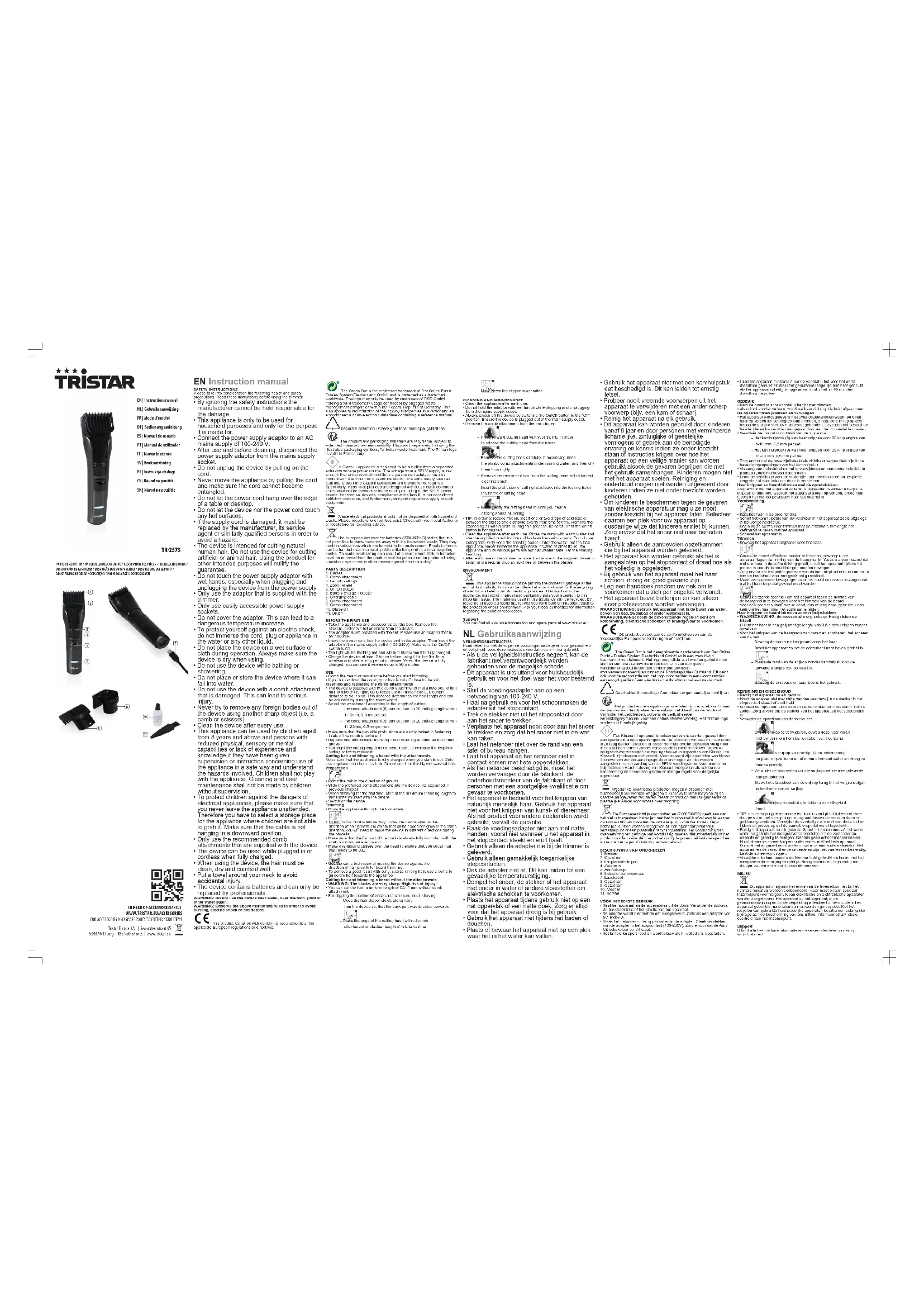 - Après chaque utilisation de l'appareil, retirez les cheveux avec la brosse de nettoyage fournie et mettez régulièrement une goutte d'huile sans acide entre les lames. ENVIRONNEMENT Cet appareil ne doit pas être jeté avec les déchets ménagers à la fin de sa durée de vie, il doit être remis à un centre de recyclage pour les appareils électriques et électroniques. Ce symbole sur l'appareil, le manuel d'utilisation et l'emballage attire votre attention sur un point important. Les matériaux utilisés dans cet appareil sont recyclables. En recyclant vos appareils, vous contribuez de manière significative à la protection de notre environnement. Renseignez-vous auprès des autorités locales pour connaître les centres de collecte des déchets. Support Vous retrouvez toutes les informations et pièces de rechange sur www.tristar.eu! DEBedienungsanleitung SICHERHEITSHINWEISE Bitte beachten Sie die folgenden Gesundheits- und Sicherheitshinweise. Lesen Sie diese Anleitung, bevor Sie den Trimmer benutzen.