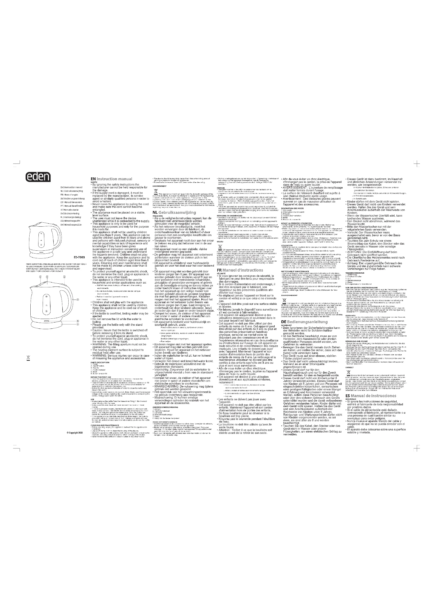 - Avertissement : Des blessures graves peuvent survenir en cas de mauvaise utilisation de l'appareil et des accessoires. DESCRIPTION DES PIÈCES1. Couvercle2. Interrupteur marche/arrêt3. Poignée4. Voyant d’alimentation5. Base6. Bouton du couvercleAVANT LA PREMIÈRE UTILISATION• Sortez l'appareil et les accessoires hors de la boîte.Retirez lesautocollants, le film protecteur ou le plastique de l'appareil.• Mettez l'appareil sur une surface stable plate et assurez un dégagementtout autour de l'appareil d'au moins 10 cm. Cet appareil ne convient pasà une installation dans une armoire ou à un usage à l'extérieur.• Faites bouillir une bouilloire d’eau avant la première utilisation pournettoyer la bouilloire et jetez cette eau.• Mettez le câble d'alimentation dans la prise. (Remarque : Assurez-vousque la tension indiquée sur l'appareil correspond à la tension localeavant de brancher l'appareil. Voltage : 220 V-240 V 50-60 Hz).UTILISATION• Retirez toujours la bouilloire de la base pour la remplir. Vous évitez ainsiles gouttes sur la base.• Veillez à ne jamais dépasser le niveau d’eau au-delà du repèremaximum d’eau.• S’il n’y a pas suffisamment d’eau, la bouilloire s’éteint et s’il y en a trop,l’eau déborde. Mettez l'appareil sous tension en appuyant surl'’interrupteur marche/arrêt. Le témoin s'allume. Dès que l'eau a bouilli,l’interrupteur marche/arrêt revient automatiquement en position d'arrêt.• Si l'appareil est accidentellement mis en marche alors qu'il est vide, laprotection contre l'ébullition à sec se déclenche automatiquement.Ajoutez de l'eau pour refroidir le mécanisme de protection contrel'ébullition à sec afin de pouvoir utiliser la bouilloire normalement.NETTOYAGE ET MAINTENANCE• Avant le nettoyage, débranchez l'appareil et attendez qu'il refroidisse.• Utilisez un chiffon doux humide pour nettoyer les surfaces de l’appareil.• Nettoyez l'appareil avec un chiffon humide. N'utilisez pas de produitsnettoyants agressifs ou abrasifs, de tampons à récurer ou de laine deverre, ceux-ci pourraient endommager l'appareil.• N’immergez jamais la bouilloire et le socle dans l’eau ou tout autreliquide.• L'appareil doit être détartré régulièrement. Utilisez un détartrant adaptéaux appareils électroménagers.• Après le détartrage, rincez plusieurs fois la bouilloire avec de l’eaupropre.ENVIRONNEMENTCet appareil ne doit pas être jeté avec les déchets ménagers à lafin de sa durée de vie, il doit être remis à un centre de recyclage pour lesappareils électriques et électroniques. Ce symbole sur l'appareil, lemanuel d'utilisation et l'emballage attire votre attention sur un pointimportant. Les matériaux utilisés dans cet appareil sont recyclables. Enrecyclant vos appareils, vous contribuez de manière significative à laprotection de notre environnement. Renseignez-vous auprès des autoritéslocales pour connaître les centres de collecte des déchets. DEBedienungsanleitung SICHERHEIT