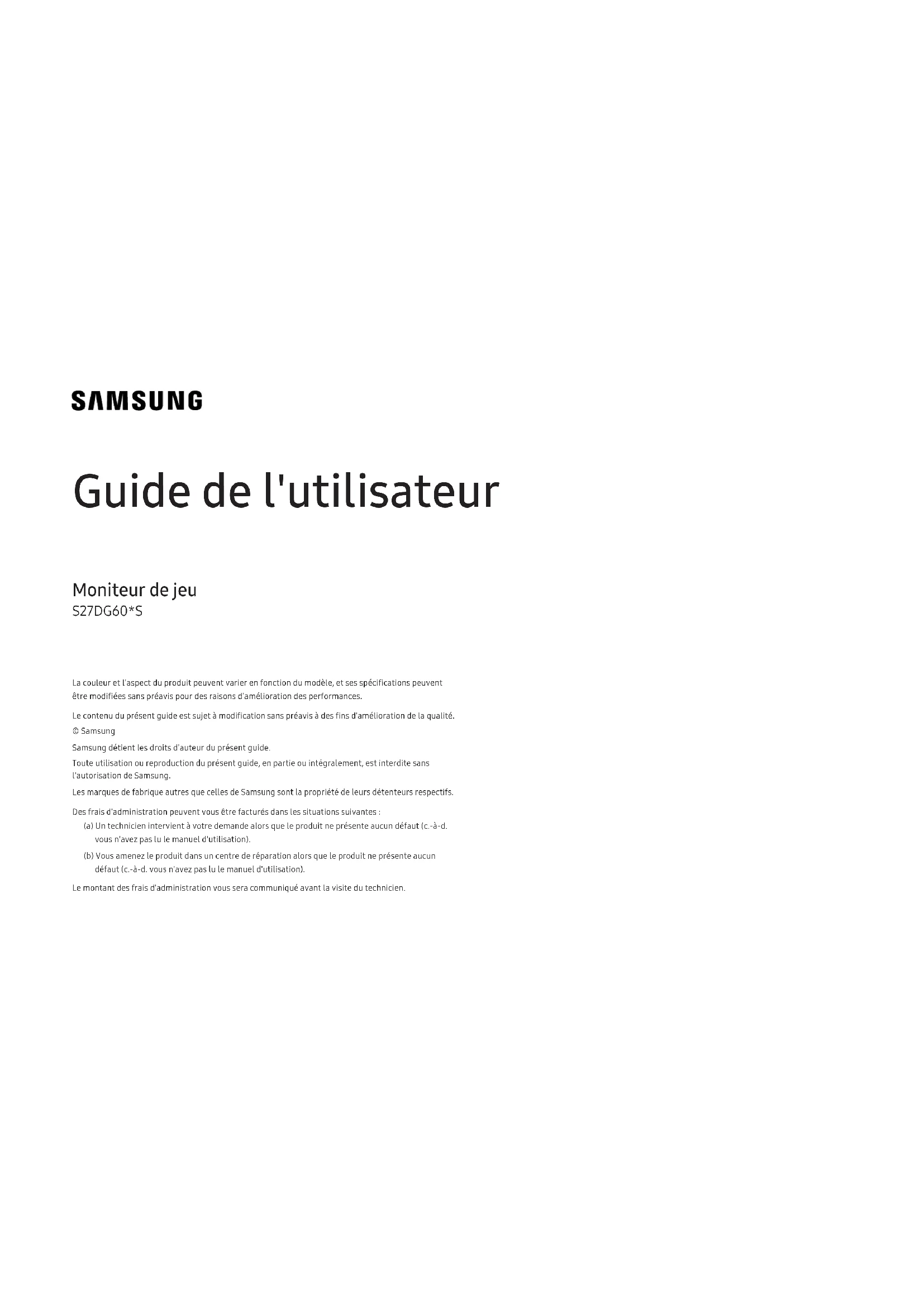 Guide de l'utilisateur Moniteur de jeu S27DG60*S La couleur et l'aspect du produit peuvent varier en fonction du modèle, et ses spécifications peuvent être modifiées sans préavis pour des raisons d'amélioration des performances. Le contenu du présent guide est sujet à modification sans préavis à des fins d'amélioration de la qualité. © Samsung Samsung détient les droits d'auteur du présent guide. Toute utilisation ou reproduction du présent guide, en partie ou intégralement, est interdite sans l'autorisation de Samsung. Les marques de fabrique autres que celles de Samsung sont la propriété de leurs détenteurs respectifs. Des frais d'administration peuvent vous être facturés dans les situations suivantes: (a) Un technicien intervient à votre demande alors que le produit ne présente aucun défaut (c.-à-d. vous n'avez pas lu le manuel d'utilisation). (b) Vous amenez le produit dans un centre de réparation alors que le produit ne présente aucun défaut (c.-à-d. vous n'avez pas lu le manuel d'utilisation). Le montant des frais d'administration vous sera communiqué avant la visite du technicien.Table des matières Avant utilisation du produit Consignes de sécurité 4 Électricité et sécurité 4 Installation 5 Fonctionnement 6 Nettoyage 8 Position correcte lors de l'utilisation du produit 8 Préparatifs Installation 9 Fixation du socle 9 Précautions lors du déplacement du produit 10 Vérification de l'espace autour du produit 11 Ajustement de l'inclinaison et de la hauteur du produit 11 Rotation du produit 13 Spécifications du kit de montage mural (VESA) 14 Panneau de configuration 15