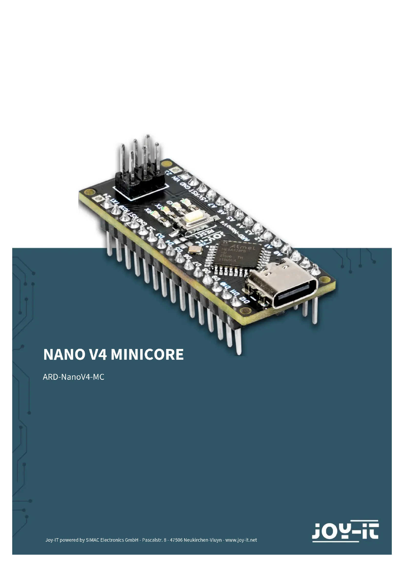 ARD-NanoV4-MC Joy-IT powered by SIMAC Electronics GmbH - Pascalstr. 8 - 47506 Neukirchen-Vluyn - www.joy-it.netChère cliente, cher client, nous vous remercions d'avoir acheté notre produit. Dans les pages qui sui- vent, nous vous montrons ce dont vous devez tenir compte lors de la mise en service et de l'utilisation. Si vous rencontrez des problèmes inattendus lors de l'utilisation, n'hésitez pas à nous contacter. Le NanoV4-MC est un microcontrôleur particulièrement petit et a été spécialement conçu pour fonctionner avec des cartes enchables grâce à l'en- tête de broche qui sort par le bas. L'interface USB Type-C intégrée peut être utilisée pour alimenter le circuit et la carte et pour transférer des programmes au microcontrôleur. Par rapport au NANO-V3, le NanoV4-MC dispose de 2 broches d'E/S supplémentaires et d'une interface I2C et SPI matérielle supplémentaire en plus de l'interface USB-C. Le bootloader utilisé est compatible avec la plupart des bibliothèques Arduino existantes.