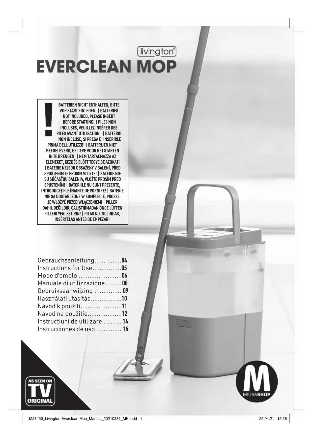 - Si vous trouvez la serpillère trop humide, mettez la pompe une nouvelle fois en marche en appuyant que le bouton « Wash » et en levant et en abaissant la serpillère plusieurs fois selon le degré d‘essorage désiré. Cela signifie que vous pouvez essuyer votre sol avec une serpillière très M23450_Livington Everclean Mop_Manual_20210331_MH.indd 7M23450_Livington Everclean Mop_Manual_20210331_MH.indd 7 29.04.21 12:2829.04.21 12:288