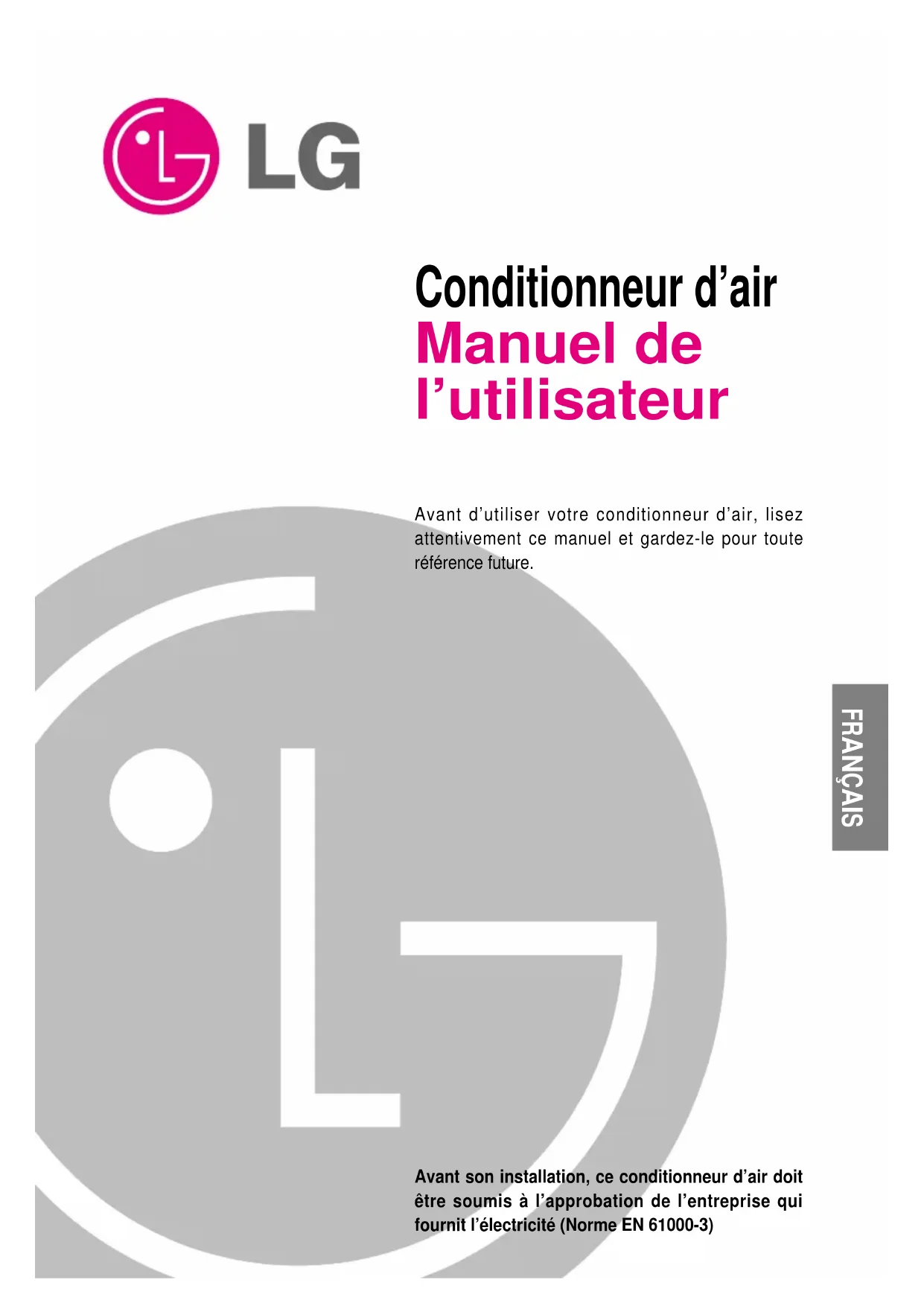Conditionneur d’air Manuel de l’utilisateur Avant d’utiliser votre conditionneur d’air, lisez attentivement ce manuel et gardez-le pour toute référence future. Avant son installation, ce conditionneur d’air doit être soumis à l’approbation de l’entreprise qui fournit l’électricité (Norme EN 61000-3) FRANÇAIS2 DANGER DANGER DANGER DANGER DANGER DANGER ATTENTION ATTENTION