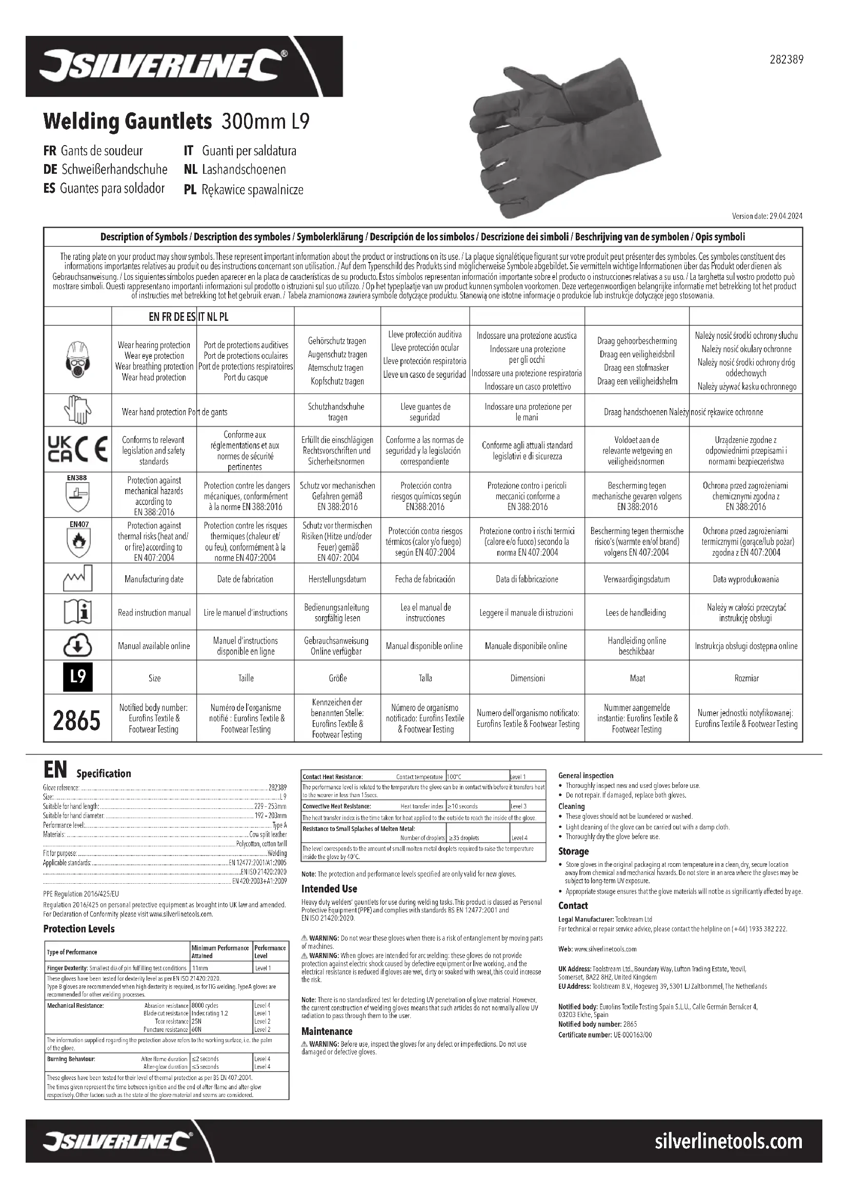 - Directive relative aux équipements de protection individuelle 2016/425/UERèglement relatif aux équipements de protection individuelle 2016/425/UE telle que mise en application et modiée par la loi britannique La déclaration de conformité est disponible sur www.silverlinetools.com Niveaux de protection Type de performancePerformance minimale obtenueNiveau de performanceDextérité des doigts : plus petit diamètre d’épingle utilisée respectant les conditions de test11 mm Niveau 1 Ces gants ont été testés pour établir leur niveau de dextérité selon la norme EN ISO 21420:2020. Les gants de type B sont recommandés lorsqu’une grande dextérité est requise, comme pour le soudage TIG. Les gants de type A sont recommandés pour les autres opérations de soudage.Résistance mécanique : Résistance à l’abrasionRésistance à la coupureRésistance à la déchirureRésistance à la perforation8 000 cyclesScore de résistance 1,2 25 N 60 N Niveau 4Niveau 1Niveau 2Niveau 2Les informations fournies ci-dessus, concernant la protection offerte, ont trait à la surface de travail du produit (c’est-à-dire la paume du gant).Résistance à l’inammabilité :Durée de combustion sans amme Durée d’incandescence sans amme≤2 secondes ≤5 secondesNiveau 4Niveau 4 Caractéristiques techniques Référence des gants : 89 Taille : p. 2823