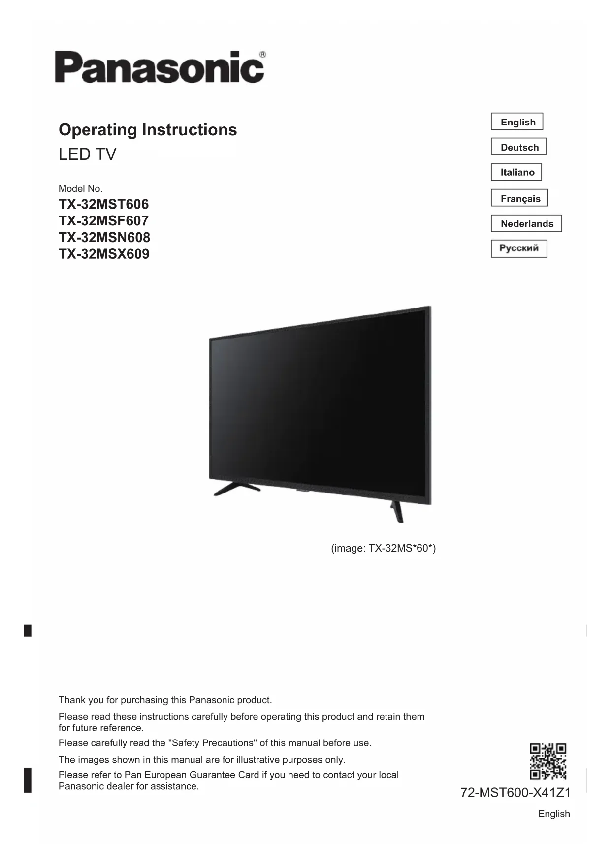 Français Imprimé en Chine Mise au rebut des équipements et des piles usagés Seulement pour l’Union européenne et les pays appliquant le recyclage Ces symboles sur les produits, l’emballage ou les documents d’accompagnement signifient que les produits électriques et électroniques et les piles usagés ne doivent pas être mélangés aux déchets ménagers généraux. Pour un traitement, une récupération et un recyclage appropriés des produits et des piles usagés, veuillez les apporter aux points de collecte prévus à cet effet, conformément à votre législation nationale. En les mettant au rebut correctement, vous contribuerez à économiser des ressources précieuses et au respect de l’environnement et à la santé humaine. Pour plus d’informations sur la collecte et le recyclage, veuillez contacter votre municipalité. Selon la législation nationale, des sanctions peuvent être appliquées en cas d’élimination incorrecte de ces déchets. Attention au symbole des batteries (symbole du bas) : Ce symbole peut être utilisé en combinaison avec un symbole chimique. Dans ce cas, il respecte les dispositions de la directive pour le produit chimique concerné.Modelnr. TX-32MST606 TX-32MSF607 TX-32MSN608 TX-32MSX609 Gebruiksaanwijzingen LED-TV Nederlands Hartelijk bedankt voor het aanschaffen van dit Panasonic-product. Lees deze instructies aandachtig door voordat u het product in gebruik neemt en bewaar ze voor toekomstige referentie. Lees vóór gebruik zorgvuldig de "Veiligheidsvoorschriften" in deze handleiding. De afbeeldingen weergegeven in deze handleiding dienen slechts ter referentie. Raadpleeg de Pan Europese Garantiekaart als u contact moet opnemen met uw plaatselijke Panasonic-dealer voor assistentie. (afbeelding: TX-32MS*60*) NederlandsNederlands