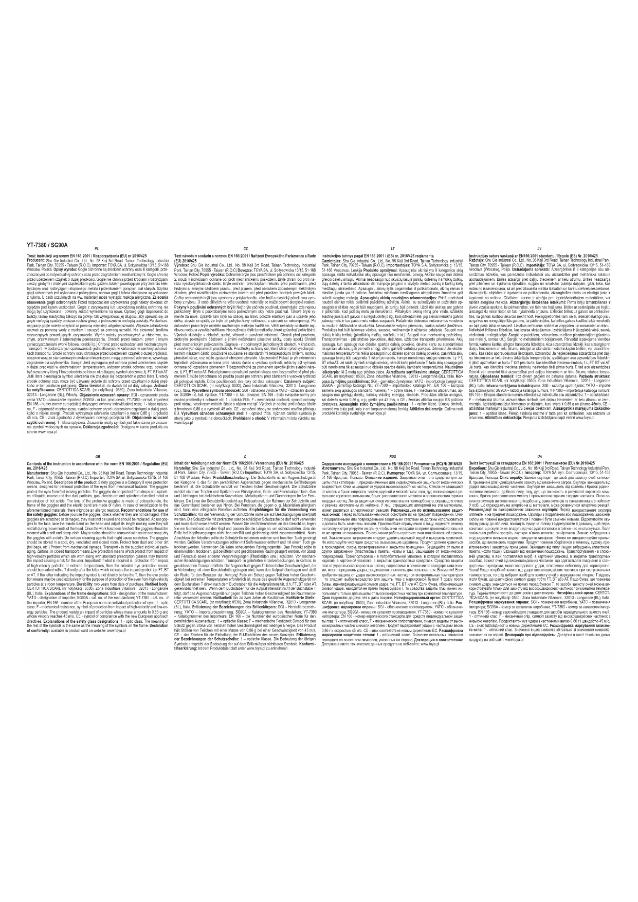 Contenu des instructions selon EN 166:2001 / Règlement (UE) n° 2016/425 Fabricant : Shu Gie Industral Co., Ltd., No. 98 Keji 3rd Road, Tainan Technology Industrial Park, Tainan City, 70955 - Taiwan (R.O.C). Importateur : TOYA SA, ul. Sołtysowicka 13/15, 51-168 Wrocław, Pologne. Description du produit : Les lunettes de protection sont des protections oculaires de catégorie II destinées à la protection individuelle contre les risques mécaniques. Les lunettes protègent contre les particules à haute vitesse. Les lunettes de protection ne protègent pas contre les gouttelettes et les éclaboussures de liquides, les particules de pous- sières grossières et fi nes, les gaz et les arcs électriques causés par les courts-circuits et les éclaboussures de métal fondu et la pénétration de solides chauds. La lentille des lunettes de protection est en polycarbonate, la monture des lunettes et la bande élastique sont en nylon. Les personnes allergiques à ces matières peuvent développer une réaction allergique. Recommandations pour l’utilisation des lunettes de sécurité : Avant d’utiliser les lunettes, les examiner pour s’assurer qu’il ne sont pas endommagées. Les lunettes dont les verres de sécurité sont rayés ou endommagés ne doivent pas être utilisées et doivent être rempla- cées par des lunettes neuves. Ajustez le cadre des lunettes à votre visage, placez la bande élastique sur votre tête et ajustez sa longueur pour vous assurer que les lunettes ne tombent pas pendant les mouvements de la tête et ne se compressent pas en même temps. Une fois le travail terminé, nettoyer les lunettes avec un chiff on doux et humide. Les grosses saletés doivent être enlevées à l’eau savonneuse et séchez à l’aide d’un chiff on. Ne pas utiliser de produits de nettoyage qui pourraient causer des érafl ures. Le produit doit être entreposé dans un endroit frais, sec, bien ventilé et fermé. Protéger contre la poussière, la poussière et autres impuretés (sacs en plastique, sacs de transport, etc.) Protéger contre les dommages méca- niques. Transport – dans des emballages unitaires livrés, dans des cartons, dans des moyens de transport fermés. Les lunettes de protection contre les particules à haute vitesse, portées avec des lunettes de vue standard, peuvent transmettre l’impact et présenter un risque pour le porteur. Attention ! Si une protection contre les chocs dus aux particules à grande vitesse est nécessaire à des températures extrêmes, le dispositif de protection oculaire sélectionné doit comporter le marquage avec la lettre T immédiatement après la lettre identifi ant le symbole de choc, c’est-à-dire FT, BT ou AT. Si la lettre indiquant le symbole d’impact n’est pas directement devant la lettre T, la protection oculaire ne peut être utilisée que pour protéger contre les par- ticules à haute vitesse à température ambiante. Durée de conservation : jusqu’à deux ans à compter de la date d’achat. Organisme notifi é : CERTOTTICA SCARL (nr notyfi kacji: 0530), Zona Industriale Villanova, 32013 - Longarone (BL), Italia. Explication des désignations de la monture : SGI – désignation du fabricant ; YATO – désignation de l’importateur ; SG90A – numéro catalogue du fabricant ; YT-7380 – numéro catalogue de l’importateur ; EN 166 – numéro de la norme européenne de protection des yeux ; 1 – classe optique ; F – résistance mécanique ; symbole pour la protection contre les chocs causés par des particules à haute vitesse et à faible énergie. Le produit peut résister à un impact de particules de 0,86 g à une vitesse de 45 m/s, marquage CE – la marque de conformité avec les directives de la nouvelle approche de l’UE. Explication des marquages du verre de protection : 1 – classe optique. La signifi cation des autres symboles est la même que celle des symboles visibles sur la mon- ture. Déclaration ce de conformité : Disponible sur la fi che produit à l’adresse www.toya.pl