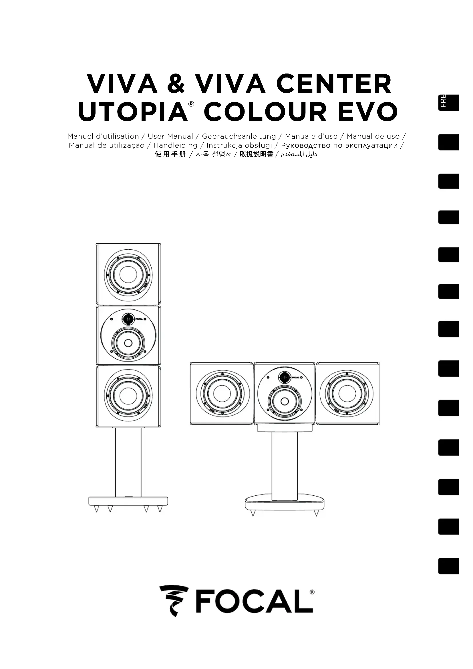 Dans un but d'évolution, Focal-JMlab se réserve le droit de modifier les spécifications techniques de ses produits sans préavis. Images non contractuelles. Pour validation de la garantie Focal-JMlab, il est maintenant possible d’enregistrer son produit en ligne : www.focal.com/garantie Vous venez d’acquérir un produit Focal et nous vous en remercions. Bienvenue dans notre univers, celui de la Haute-Fidélité. Innovation, tradition, excellence et plaisir sont nos valeurs ; notre seul objectif est de vous offrir un son pur, fidèle et riche. Afin d’exploiter toutes les performances de votre produit, nous vous conseillons de lire les instructions de ce livret puis de le conserver soigneusement pour vous y référer ultérieurement.Branchements Les connecteurs de Viva assurent des contacts fiables et polyvalents, pour des câbles dénudés (jusqu’à 4 mm de diamètre) ou des fourches. Il est impératif de respecter la polarité des enceintes. Le connecteur marqué « + » doit être connecté sur la sortie correspondante de l’amplificateur, le connecteur marqué « - » sur la borne négative (fig. A). Si cette condition n’est pas respectée, l’image stéréo et la perception du grave se dégraderont considérablement.Choix de l'emplacement Vos enceintes ont été étudiées pour restituer le plus fidèlement possible tous les programmes home-cinéma. Il convient toutefois d’observer quelques règles simples pour optimiser leurs performances, garantir un bon équilibre tonal et une image sonore réaliste. Pour des configurations home cinéma classique en 5.1 et 7.1, les angles, entre les enceintes et l’auditeur, préconisés sur les schémas (fig. B) et (fig. C) doivent être respectés. L’enceinte centrale devra étre placée à proximité de l’écran pour une restitution réaliste des dialogues. Pour des performances optimales, Focal recommande l’utilisation de 3 enceintes verticales Viva sur l’avant (fig. D). Viva doit être utilisée en position horizontale uniquement lorsque la configuration optimale ne peut être réalisée (fig. E et fig. F). Accessoires Les enceintes Viva sont fournies avec quatre pointes de découplage en acier (fig. G) et quatre cônes en caoutchouc, (fig. H) à visser au besoin sur les quatre inserts métalliques situés à la base de l’enceinte. Ces pointes permettent de garantir une excellente stabilité des enceintes, notamment lorsque le sol n’est pas parfaitement plan et lisse. Cette stabilité est essentielle pour que l’énergie fournie par les membranes des woofers soit intégralement restituée sous forme de son. Les pointes fournies sont réglables en hauteur, de manière à ce que les quatre pointes reposent uniformément au sol sans aucun basculement. Nous vous conseillons de placer entre le sol et la pointe les contre-pointes pour ne pas rayer le carrelage ou abîmer le parquet. L’enceinte peut être posée sur un pied optionnel conçu spécifiquement pour elle.Période de rodage Les haut-parleurs utilisés dans les enceintes Viva sont des éléments mécaniques complexes qui exigent une période d’adaptation pour fonctionner au mieux de leurs possibilités et s’adapter aux conditions de température et d’humidité de votre environnement. Cette période de rodage varie selon les conditions rencontrées et peut se prolonger pendant quelques semaines. Pour accélérer cette opération, nous vous conseillons de faire fonctionner vos enceintes une vingtaine d’heures à niveau moyen, avec des programmes musicaux standards mais chargés en grave. Une fois les caractéristiques de l’enceinte totalement stabilisées, vous pourrez profiter intégralement de ses performances.VIVA UTOPIA