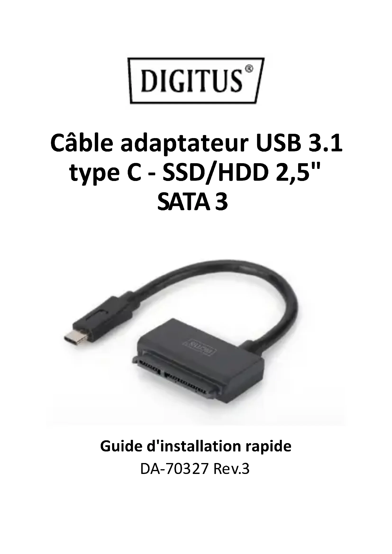 Câble adaptateur USB 3.1 type C - SSD/HDD 2,5" SATA 3 Guide d'installation rapide DA-70327 Rev.32 Description Ce convertisseur peut être connecté via l’interface USB Type-C™ à un PC ou un ordinateur portable. Ainsi, différents dispositifs SATA avec interface SATA 22 broches peuvent être utilisés. Spécifications