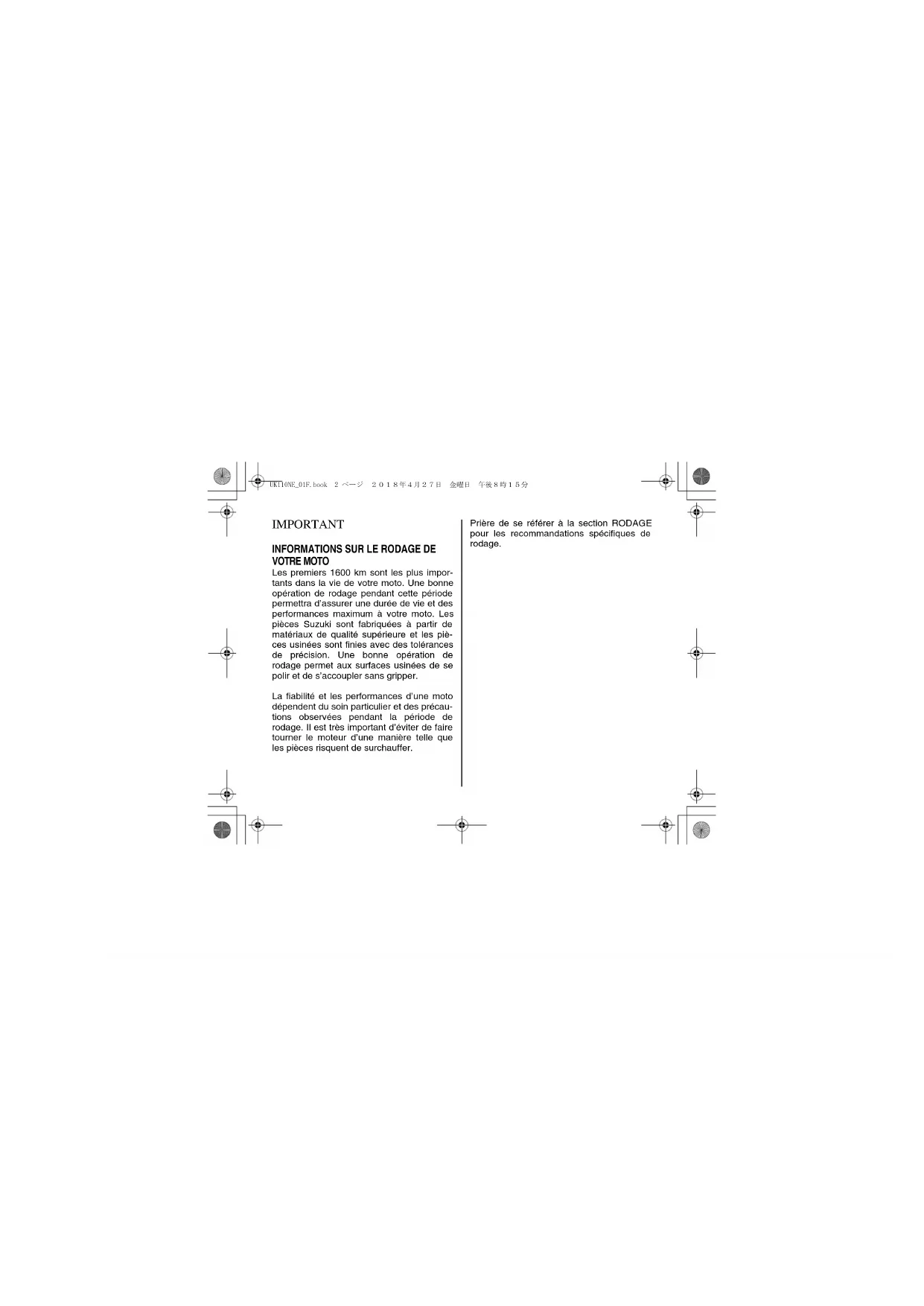 VOTRE MOTO Les premiers 1600 km sont les plus impor- tants dans la vie de votre moto. Une bonne opération de rodage pendant cette période permettra d’assurer une durée de vie et des performances maximum à votre moto. Les pièces Suzuki sont fabriquées à partir de matériaux de qualité supérieure et les piè- ces usinées sont finies avec des tolérances de précision. Une bonne opération de rodage permet aux surfaces usinées de se polir et de s’accoupler sans gripper. La fiabilité et les performances d’une moto dépendent du soin particulier et des précau- tions observées pendant la période de rodage. Il est très important d’éviter de faire tourner le moteur d’une manière telle que les pièces risquent de surchauffer. Prière de se référer à la section RODAGE pour les recommandations spécifiques de rodage. UK110NE_01F.book 2 ページ 2018年4月27日 金曜日 午後8時15分 AVERTISSEMENT /