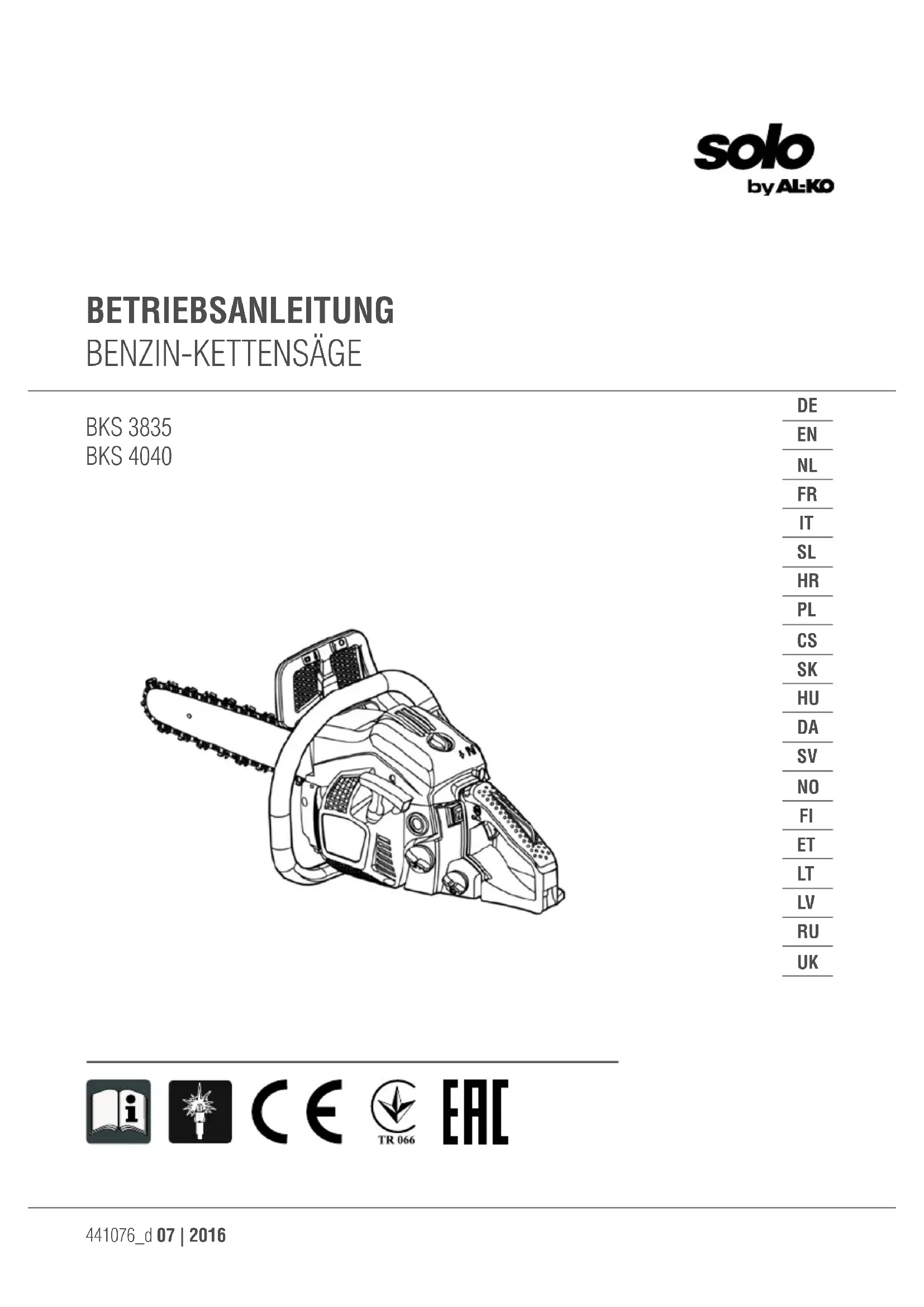 - DÉCLARATION DE CONFORMITÉ CE ATTENTION! Avant d'utiliser nos produits, veuillez lire soigneusement le présent manuel pour vous familiari- ser avec l'appareil. Conservez toujours ce manuel à portée de main. ATTENTION! Les mises en garde marquées par les symboles correspondants de ce manuel indiquent des points critiques à prendre en considération afin d'éviter tout risque de blessure ; veuillez lire les présentes instructions soigneusement et tenez en compte pendant l'utilisation. ATTENTION! Ce symbole caractérise des instructions à suivre afin d'éviter des accidents pouvant entraîner des blessures ou la mort. ATTENTION! Ce symbole caractérise des instructions à suivre afin d'éviter des dysfonctionnements mécani- ques, des accidents ou des dommages. ATTENTION! Lisez attentivement ces instructions avant de commencer à travailler avec la scie et conser- vez-les soigneusement. Veuillez lire attentivement les instructions. Familiarisez-vous avec les éléments de commande afin de pouvoir utiliser l'appareil en toute sécurité. Conservez la présente instruction d'utilisation avec la tronçonneuse.441076_d 73 ATTENTION! Risque de lésions de l'ouïe ! Dans des conditions de fonctionnement normales, l'utilisateur de l'appareil peut être soumis à un niveau sonore de 80 dB(A) ou plus. La tronçonneuse est à saisir de la main droite au niveau de la poignée arrière et de la main gauche au niveau de la poignée avant. ATTENTION! Protection contre le bruit ! Lors de l'utilisation de l'appareil, les consignes locales sont à respecter. USAGES CONFORMES ET NON CONFORMES DE L'APPAREIL. La tronçonneuse est prévue pour scier des troncs d'arbres, des palettes, et pour scier des branches selon la longueur de coupe. Elle ne doit être employée que pour le travail du bois. Pendant son utilisation, une protection individuelle (PSA) suffisante est nécessaire. Tout autre utilisation comme par ex. le soin professionnel à l'intérieur des arbres est expressément exclue. Pour les dommages ou les blessures causées par une erreur de manipulation, la responsabilité incombe à l'utilisateur / l'usager et pas au fabricant. Seules les chaînes de tronçonnage et les combinaisons de guides-chaîne citées dans la notice d'utilisation, doivent être utilisées. Pour un usage conforme, il est nécessaire de respecter les consignes de sécurité ainsi que les indications d'utilisation du mode d'emploi. Toute personne utilisant l'appareil doit être familiarisée avec celui-ci et être consciente du risque encouru. En outre, les prescriptions de prévention des accidents sont à prendre impérativement en considération. Les consignes en matière de médecine et de sécurité du travail sont également à respecter. En cas de modifications de l'appareil toute responsabilité du fabricant est annulée pour les dommages pouvant en découler ainsi que la garantie de l'appareil. Cet appareil est destiné à un usage privé dans le domaine du jardinage. AVERTISSEMENT! Veuillez vous conformer SVP aux consignes nationales pour l'usage des tronçonneuses ! (pro- tection au travail, environnement) INDICATIONS Même lors d'un usage conforme de l'appareil, il n'est pas possible d'exclure un risque résiduel. Le type et la construction de l'appareil font que les risques suivants ne peuvent être écartés : contact avec la partie non protégée de la chaîne de coupe (coupures) mouvements soudains et inattendus du guide-chaîne (coupures) pertes d'audition suite au refus de porter la protection auditive prescrite inhalation de particules nocives et de gaz d’échappement contact de la peau avec l'essence nuisance due au bruit. Un certain niveau de bruit de la machine ne peut être évité. La nuisance sonore, dans le domaine public, doit avoir fait l'objet d'une autorisation et être limitée dans le temps. Les pauses doivent être respectées et le temps de travail peut faire l'objet de restrictions. Une pro- tection auditive adaptée doit être portée par l'opérateur et les personnes travaillant à proximité.fr Position des éléments 74 BKS 3835 / BKS 4040 Vibrations. Mise en garde: le niveau réel de vibration pendant le fonctionnement de la tronçonneuse peut être différent de l'information contenue dans le manuel ou les instructions du fabricant. La raison de cela peut être l'un des facteurs suivants qui doivent être pris en compte avant et pendant l'utilisation : respect des instructions d'utilisation de la tronçonneuse opération de coupe et traitement des débris de coupe usage conforme et état de la tronçonneuse niveau d'affûtage et état de l'outil de coupe montage en option de poignées résistantes aux vibrations et fixation de ces poignées sur le boîtier de la tronçonneuse si, après usage de la machine, vous avez une sensation anormale ou constatez une coloration de la peau des mains, accordez-vous une pause adaptée. Sans pauses, un syndrome des vibrations main- bras peut apparaître. p. 95