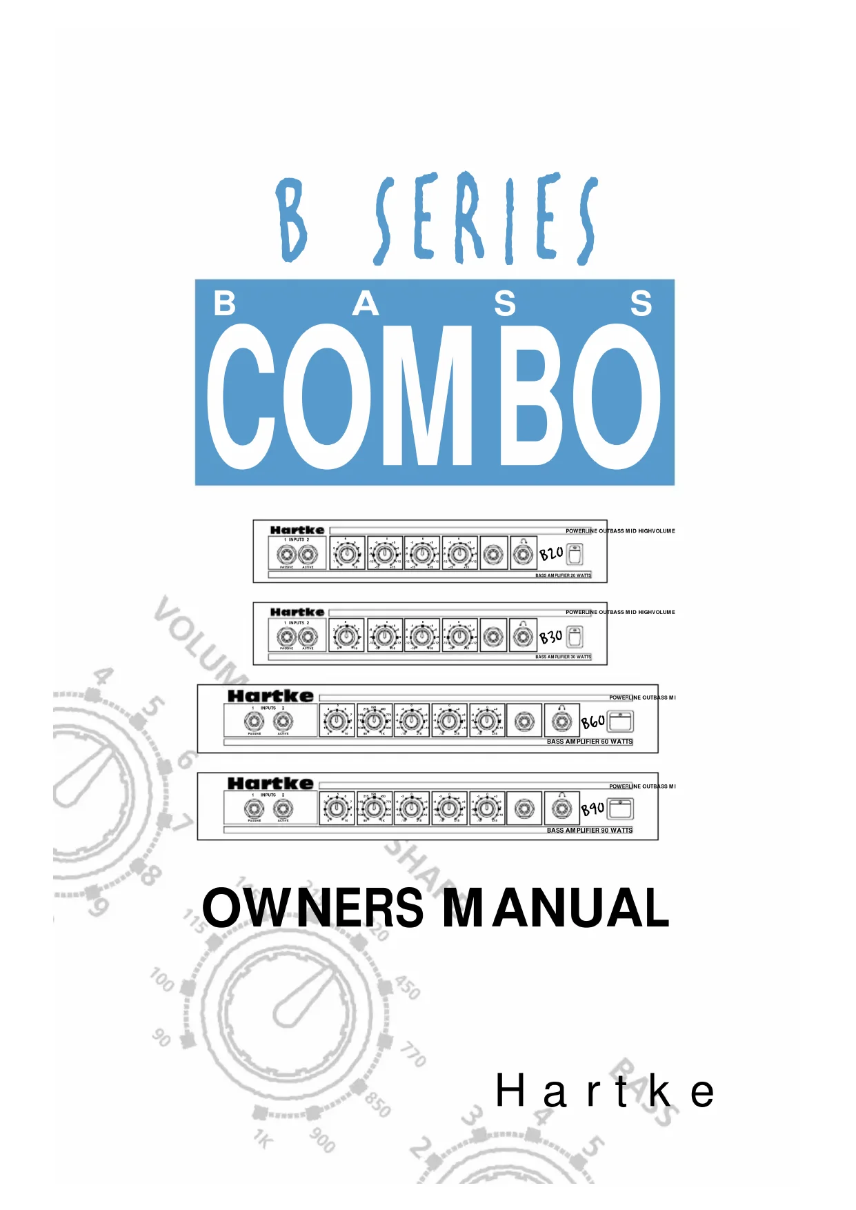 ENGLISHIntroduction Bien sûr, les manuels d'utilisation sont fastidieux, mais l'amplificateur pour guitare basse que vous venez d'acquérir est l'un des meilleurs existants et nous tenions à vous le présenter ! Alors, avant que de brancher votre basse et de commencer à jouer, consacrez quelques minutes à parcourir ces pages. Nous avons tenté de faire en sorte que cela soit le moins ennuyeux possible et, qui sait, vous allez peut-être apprendre une ou deux petites astuces. Les modèles de la série B sont des amplificateurs combo puissants, équipés d'un haut-parleur grave 8 Ohms placé dans un caisson étudié spécialement pour lui. Ce sont des systèmes parfaitement adaptés aux salles de petite taille comme les clubs ou les habitations individuelles. Ils sont par ailleurs dotés d'une prise casque qui les rend vraiment très pratiques. La Série B se compose de cinq différents modèles qui sont tous décrits dans ce manuel. Le B20 est le modèle d'entrée de gamme de la famille. Il est doté d'un amplificateur 20 Watts et d'un haut-parleur de 20 cm. Vient ensuite le B30 d'une puissance de 30 Watts et son haut-parleur de 25 cm. Le B60 offre pour sa part une puissance 60 Watts et un haut-parleur de 30 cm. L’amplificateur pour guitare basse B90 développe une puissance impressionnante de 90 Watts délivrée par un haut-parleur de 15". Son ainé, le B120, délivre une puissance impressionnante de 120 Watts. Il est équipé de deux haut-parleurs 12" permettant d’obtenir plus de puissance dans les basses ainsi qu’une meilleure dispersion. Quel que soit le modèle choisi, vous êtes assuré de la fiabilité et de la qualité sonore Hartke. Ce manuel vous donne une description détaillée des nombreuses fonctions des amplificateurs pour guitare basse de la série B, un aperçu des faces avant et arrière des appareils, des procédures d'utilisation détaillées, des consignes de réglage de l'amplificateur, les caractéristiques techniques et bien d'autres renseignements encore sur l'égalisation et sur la fonction Shape (délivrés par les modèles B60, B60 et B120), exclusive des produits Hartke. L'amplificateur est livré avec une carte de garantie. N'oubliez pas de la remplir et de nous la renvoyer pour bénéficier de l'assistance technique et pour recevoir des renseignements sur les nouveaux produits Hartke et Samson. NOTE : Contactez votre revendeur Hartke pour toute réparation.