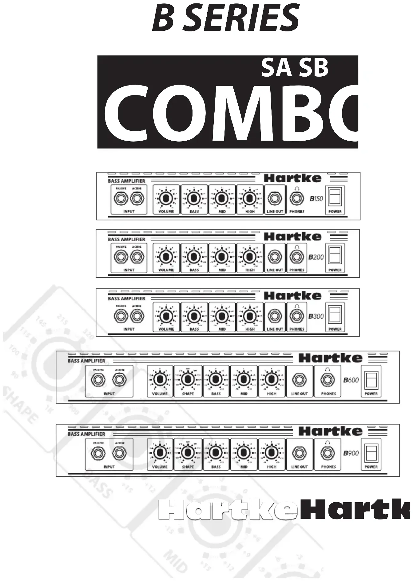 dures d'utilisation détaillées, des consignes de réglage de l'amplificateur, les caractéristiques techniques et bien d'autres renseignements encore sur l'égalisation et sur la fonction Shape (délivrés par les modèles B60, B60 et B120), exclusive des produits Hartke. L'amplificateur est livré avec une carte de garantie. N'oubliez pas de la remplir et de nous la renvoyer pour bénéficier de l'assistance technique et pour recevoir des renseignements sur les nouveaux produits Hartke et Samson. NOTE : Contactez votre revendeur Hartke pour toute réparation.