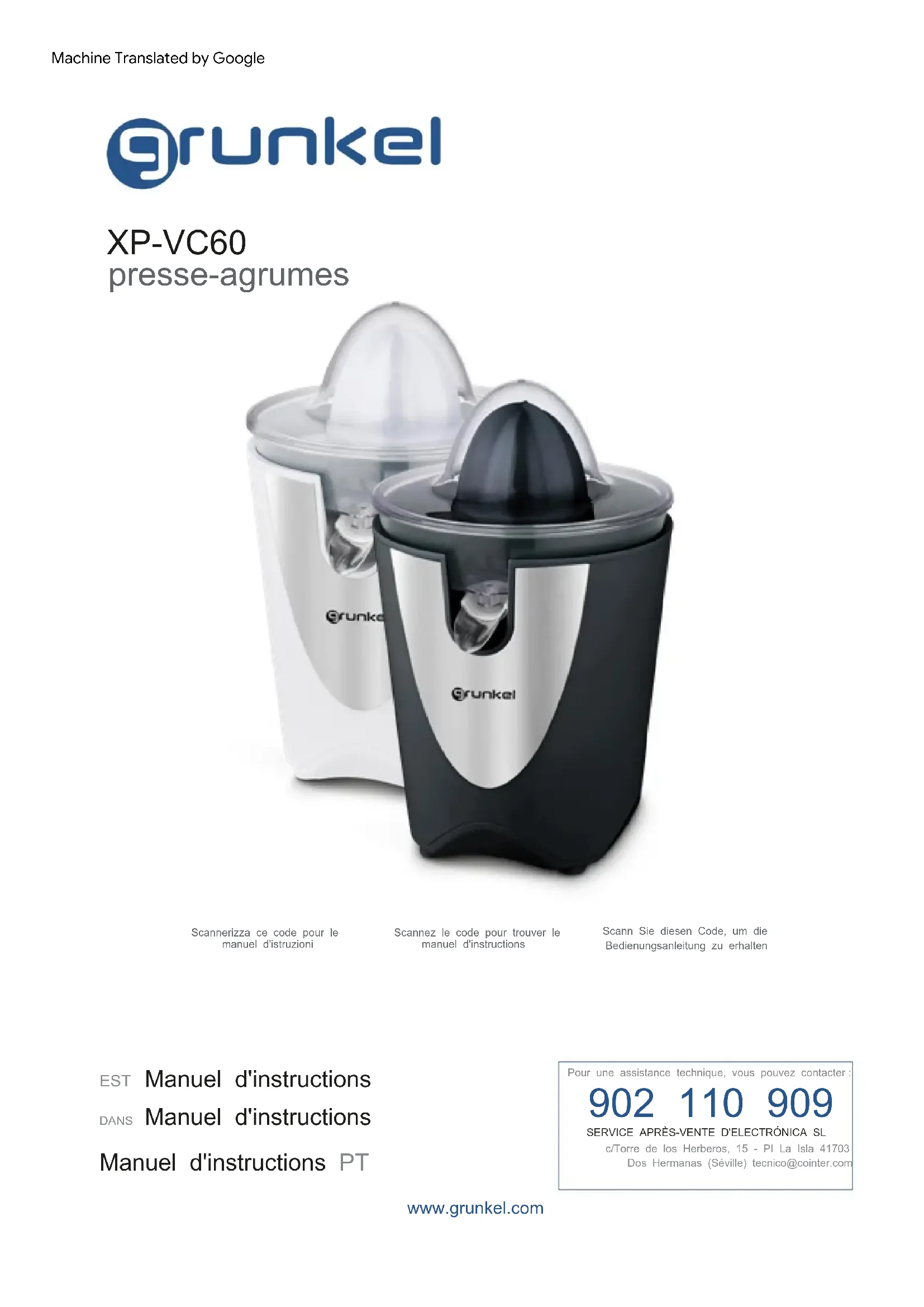 EST Manueld'instructions Manueld'instructionsPT Manueld'instructions DANS presseagrumes www.grunkel.com Machine Translated by GoogleDécouvrezlerestedenotregammesurwww.grunkel.com GRUNKELmetàvotredispositiondesproduitsinnovants,durablesetpratiques.Lorsqu'ilest utilisédemanièreresponsableetavecunentretienapproprié,ilvousoffriraunelongueduréede vieutileetcontribueraàrendrelaviequotidiennebeaucoupplusfacile. Nousapprécionsvotreconfianceetespéronsquevousl'apprécierez. Cemanueld'instructionsestunereproductionfidèledesspécifications,dufonctionnementetdel'apparenceduproduitquevousvenez d'acheter,àl'exceptiondeserreurstypographiques,d'impressionoudetraduction.Lesspécifications,lefonctionnementetlesfonctionnalités deceproduitsontsusceptiblesd'êtremodifiéssanspréavis. Cemanuelestunereproductionfidèleentermesdecaractéristiques,defonctionnementetd'esthétiqueduproduitquevousavezacheté,à l'exceptiondeserreurstypographiques,d'impressionoudetraduction.Lesspécifications,lefonctionnementetlescaractéristiquesdecet appareilsontsusceptiblesd'êtremodifiéssanspréavis. Cemanuelestunereproductionfidèleentermesdecaractéristiques,defonctionnementetd'esthétiqueduproduitquevousavezacheté,à l'exceptiondeserreurstypographiques,d'impressionoudetraduction.Lesspécifications,lefonctionnementetlescaractéristiquesdecet appareilpeuventêtremodifiéssanspréavis. MERCID'AVOIRCHOISICEPRODUITGRUNKEL Machine Translated by Google•Conservezégalementlagarantie,lereçud'achatoulafactureet,si possible,laboîteavecl'emballageintérieurpourd'éventuelles demandesfutures. Nelaissezpaslecordonpendreduborddelatableoudel'étagère.Tenezleéloignédes surfaceschaudes.Nelelaissezpasentrerencontactavecdesobjetspointusoucontondants. Nepasfairefonctionnersilecordonoulaficheestendommagéousivousremarquezque l'appareilnefonctionnepascorrectement.