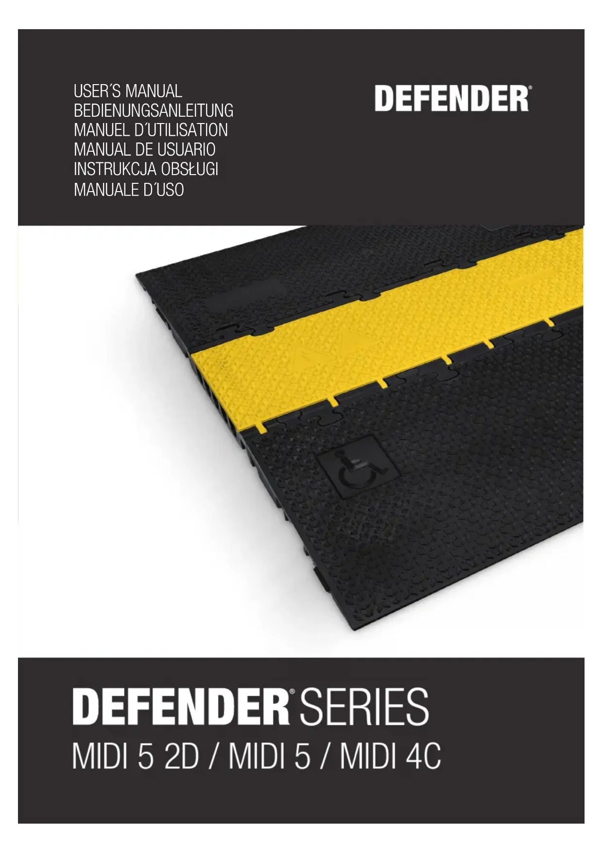 - Après entretien de la charnière, nettoyez les éventuels produits en excès.36 ENGLISHDEUTSCHFRANCAISESPAÑOLPOLSKIITALIANO SERIES SERIES DESCRIPTION GLOBALE Les passages de câbles servent à la protection de câbles passant sur le sol dans le cadre d’installations temporaires : par exemple, lors de salons commerciaux, de marchés, ou en sonorisation. Les passages de câbles assurent la protection des personnes contre tout risque de trébuchement. Vous vous êtes décidé pour la Série DEFENDER