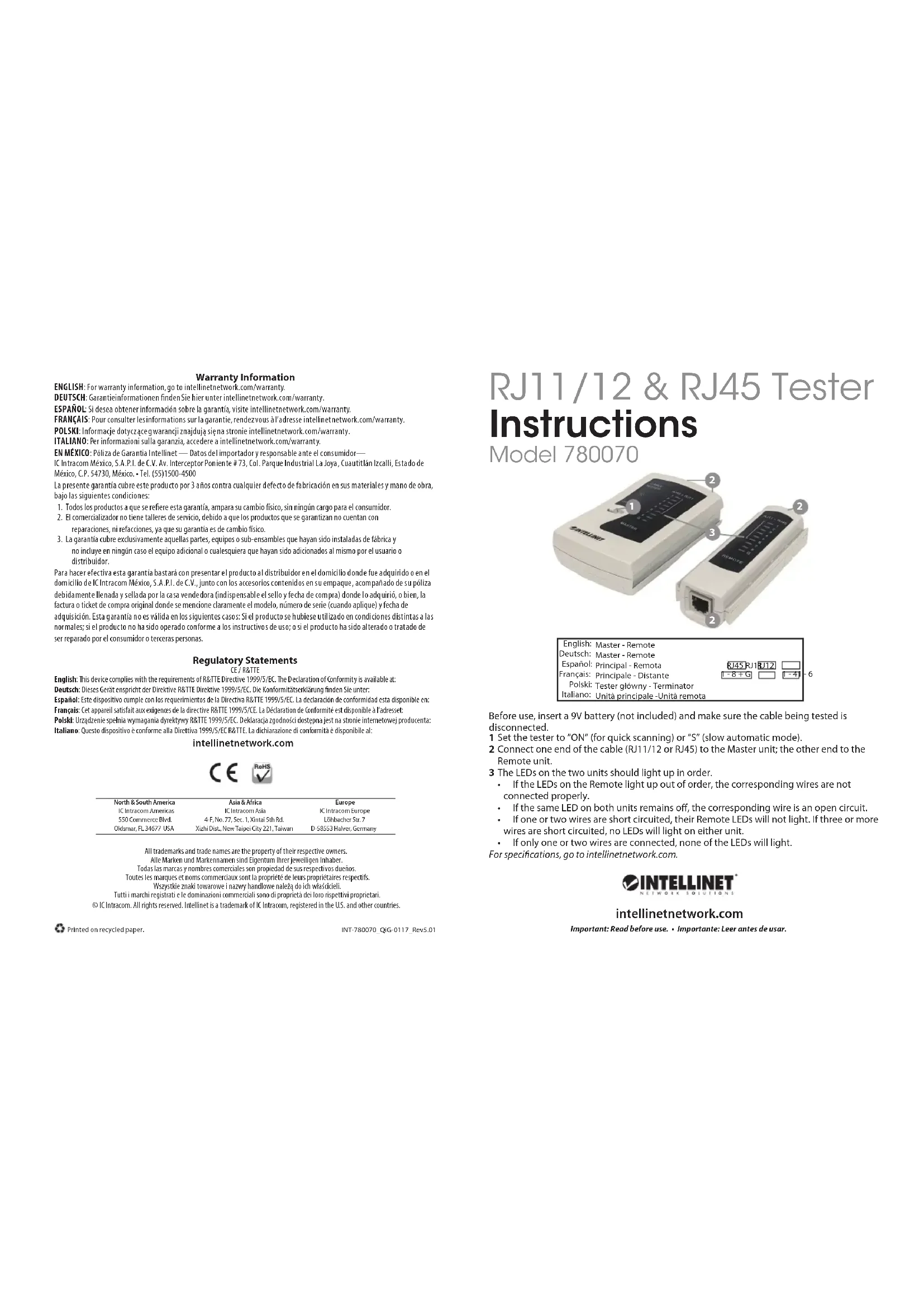 Antes de usar el Probador de cable, inserte una batería 9v (no incluida) asegúrese que el cable a probar no se encuentre conectado. Para más especicaciones, visite intellinetnetwork.com. Français: Kit d’outils pour réseau (4 unités) Avant utilisation, insérez une pile 9 V (non incluse) et assurez-vous que le câble en cours de test est débranché. Réglez le testeur sur « ON » (pour un balayage rapide) ou sur « S » (mode automatique lent). Connectez l’une des extrémités du câble (RJ11/12 ou RJ45) à l’unité principale et l’autre extrémité à l’unité distante. Les DEL des deux unités doivent s’allumer dans l’ordre.