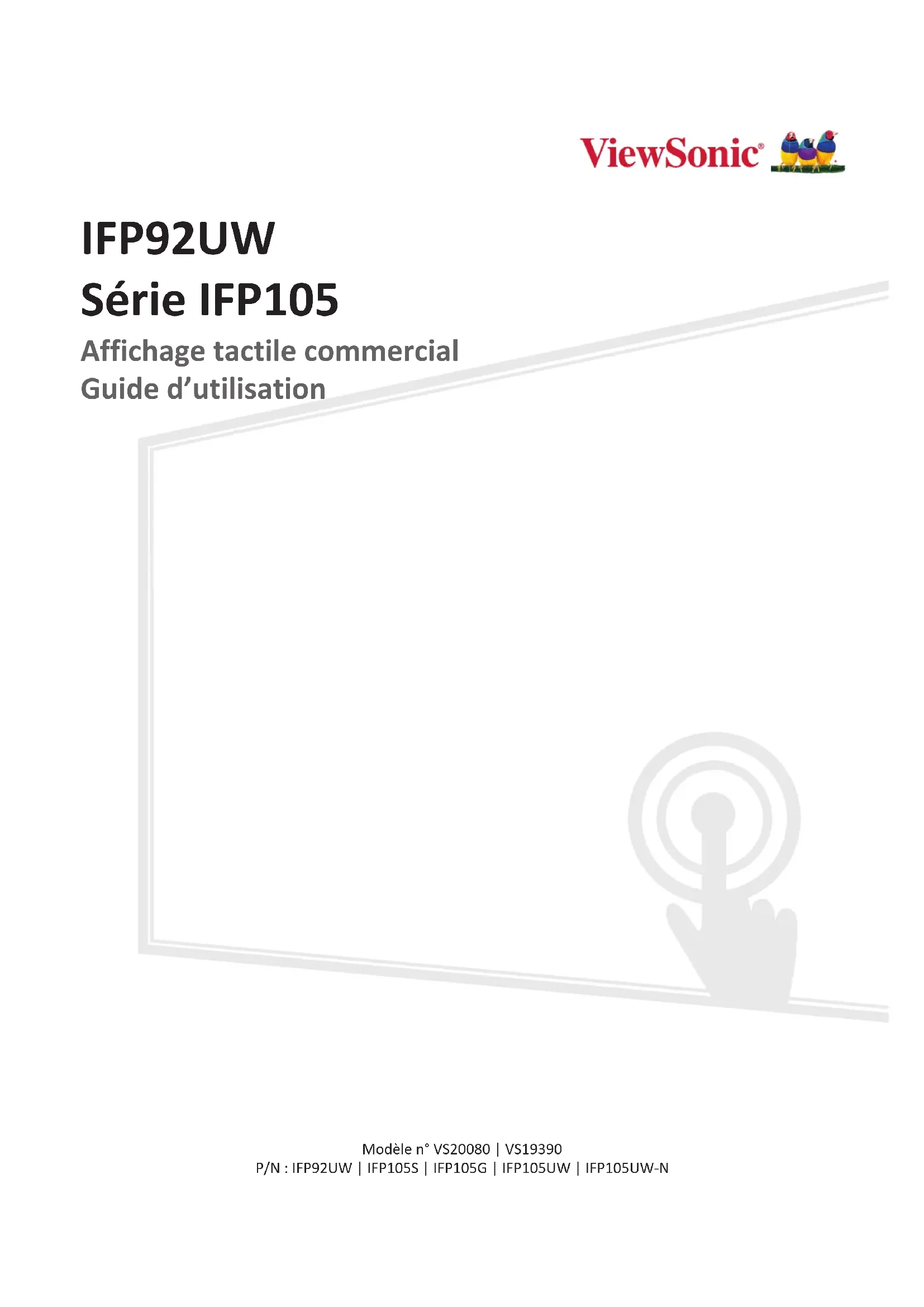Modèle n° VS20080 | VS19390 P/N : IFP92UW | IFP105S | IFP105G | IFP105UW | IFP105UW-N IFP92UW Série IFP105 Affichage tactile commercial Guide d’utilisation2 Merci d’avoir choisi ViewSonic® En tant que leader mondial de solutions visuelles, ViewSonic® se consacre à dépasser les attentes du monde en matière d’évolution technologique, d’innovation et de simplicité. Chez ViewSonic®, nous pensons que nos produits peuvent avoir un impact positif dans le monde et nous sommes convaincus que le produit ViewSonic® que vous avez choisi vous servira correctement. Une fois de plus, merci d’avoir choisi ViewSonic® !3 Précauons relaves à la sécurité Veuillez lire les Précauons de sécurité qui suivent avant de commencer à uliser l'appareil.