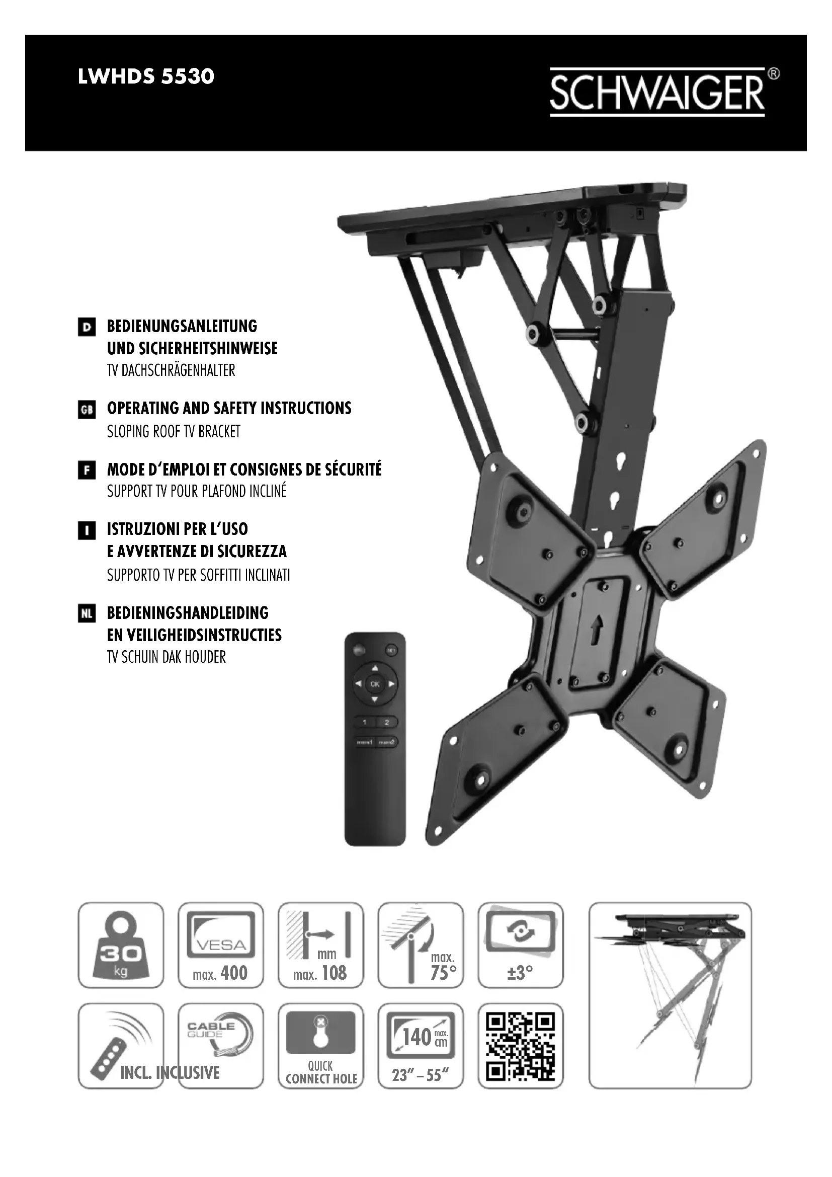 G É N É R A L Li s e z l e m o d e d ‘e m p l o i e t c o n s e r v e z - l e e n l i e u s û r Toutes nos félicitations et tous nos remerciements pour l‘achat de ce produit SCHWAIGER. Ce mode d‘emploi fait partie de ce produit. Il contient des informations importantes sur la manière de mettre en service et d‘utiliser le produit. Le produit fonctionne avec de l’électricité. Lisez attentivement les instructions pour éviter les brûlures, les incendies et les chocs électriques, pour garantir une utilisation sûre et correcte du système et pour préserver la durée de vie du produit en général et de l’électronique intégrée en particulier. Conservez le mode d‘emploi en lieu sûr pendant toute la durée de vie du produit et remettez-le à l‘utilisateur ou au propriétaire suivant. Vérifiez que le contenu du paquet est complet et assurez-vous qu‘aucun élément n‘est manquant ou abîmé. U T ILIS A T ION PR É V U E Le produit est destiné à un usage privé uniquement et ne convient pas à un usage commercial. N’utilisez le produit que conformément aux indications données dans le présent mode d’emploi. Toute autre utilisation est considérée comme inappropriée et peut entraîner des dommages matériels. Ce produit est utilisé pour le montage d’équipements de télévision appropriés sur des plafonds droits ou inclinés. Son réglage est motorisé, la commande s’effectue à l’aide de la télécommande fournie. Seul l’adaptateur secteur fourni peut être utilisé comme alimentation pour le réglage motorisé. L’alimentation n’est homologuée que pour une connexion à une tension alternative de 100-240 V/60/50 Hz. L’écran de télévision monté ne doit pas dépasser les dimensions et le poids maximum admissibles spécifiés pour le produit. L’utilisation n’est autorisée que dans des locaux fermés, pas à l’extérieur. Tout contact avec l’humidité, par exemple dans une salle de bains, doit être absolument évité. C ON T EN U DE LA LIV R A IS ON A ( x 1 ) Support TV pour plafond (motorisé) B ( x 1 ) Plaque VESA G ( x 1 ) Adaptateur secteur M- B ( x 4 ) Vis M6x14 M- F ( x 4 ) Rondelle D5 W - B ( x 6 ) Cheville pour béton SX Ø10x50 M- C ( x 4 ) Vis M6x30 M- G ( x 4 ) Rondelle D8 W - C ( x 4 ) Rondelle D6 M- H ( x 8 ) Petit espaceur Ø15xØ8x5 M- A ( x 4 ) Vis M5x14 M- E ( x 4 ) Vis M8x50 W - A ( x 6 ) Vis ST6.3x55 M- D ( x 4 ) Vis M8x30 M- I ( x 8 ) Gros espaceur Ø15xØ8x15 H ( x 1 ) Télécommande I ( x 4 ) Attache de câbles E ( x 2 ) Adaptateur VESA (gauche) F ( x 2 ) Adaptateur VESA (droit) C ( x 1 ) Gabarit de perçage D ( x 2 ) Couvercle (droit/gauche)MODE D‘EMPLOI