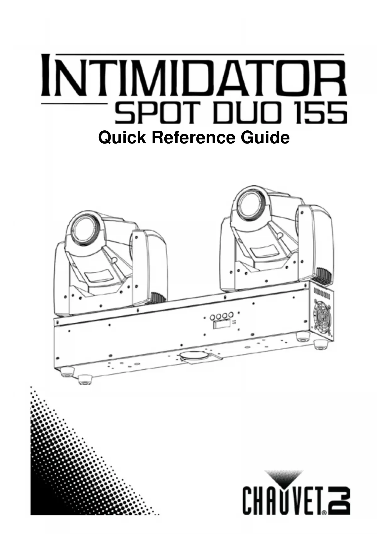 Le Manuel de Référence (MR) de l'Intimidator Spot Duo 155 reprend des informations de base sur cet appareil notamment en matière de montage, d'options de menu et d'affe ctations DMX. Pour plus d'informations, veuillez télécharger le manuel de l'utilisateur sur le site internet de Chauvet