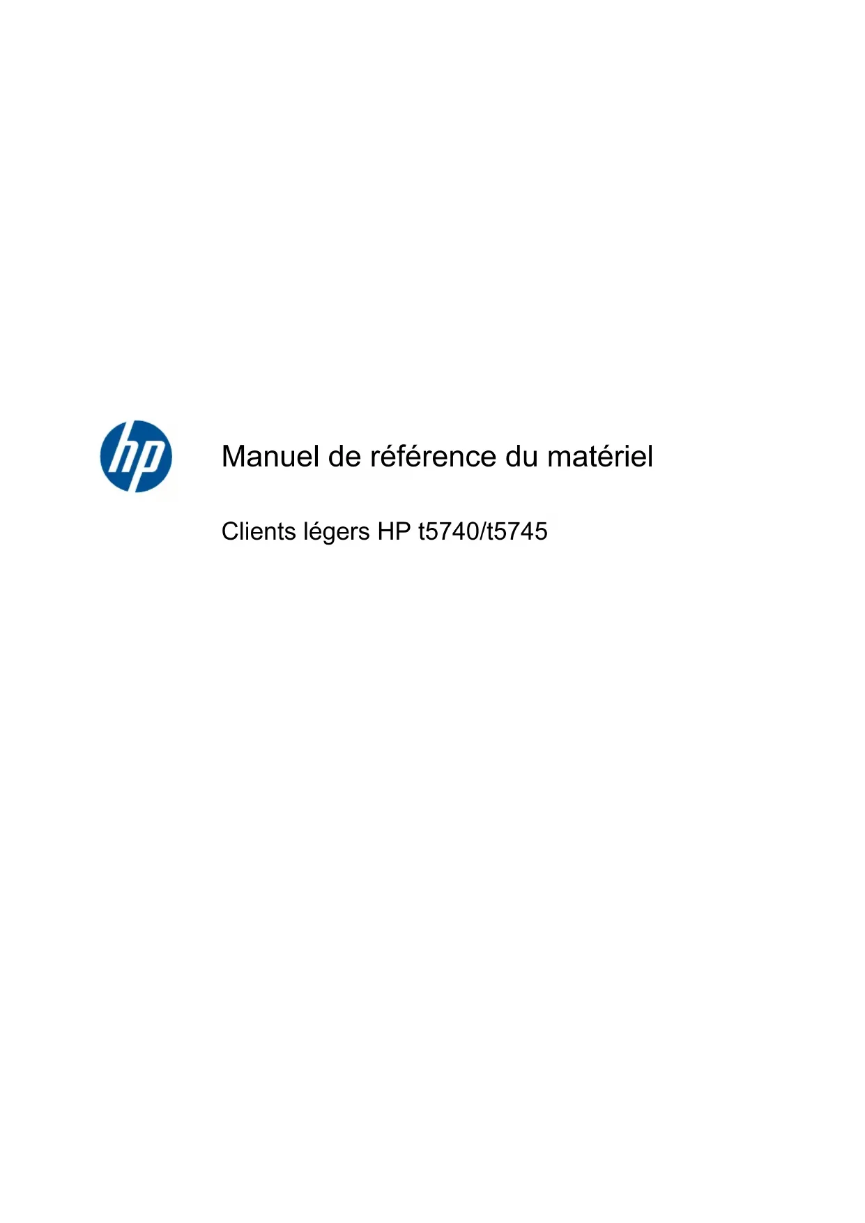 - Manuel de référence du matériel Clients légers HP t5740/t5745© Copyright 2009-2010 Hewlett-Packard Development Company, L.P. Les informations données dans ce document peuvent faire l'objet de modifications à tout moment. Microsoft et Windows sont des marques déposées de la société Microsoft aux États- Unis et dans d'autres pays. Les garanties applicables aux produits et services HP sont énoncées dans les textes de garantie accompagnant ces produits et services. Aucune partie du présent document ne saurait être interprétée comme constituant un quelconque supplément de garantie. HP ne peut être tenu responsable des erreurs ou omissions techniques ou de rédaction de ce document. Ce document contient des informations protégées par des droits d'auteur. Aucune partie de ce document ne peut être photocopiée, reproduite ou traduite dans une autre langue sans l'accord écrit préalable de Hewlett-Packard. Manuel de référence du matériel Clients légers HP t5740/t5745 Deuxième édition (octobre 2010) Première édition (septembre 2009) Référence du document : 585651-052À propos de ce livre AVERTISSEMENT ! Le non-respect de ces instructions présente des risques potentiellement très graves. ATTENTION : Le non-respect de ces instructions présente des risques pour le matériel et les informations qu'il contient. REMARQUE : Le texte ainsi défini fournit des informations importantes supplémentaires. FRWW iiiiv À propos de ce livre FRWWSommaire 1 Caractéristiques du produit p. 1