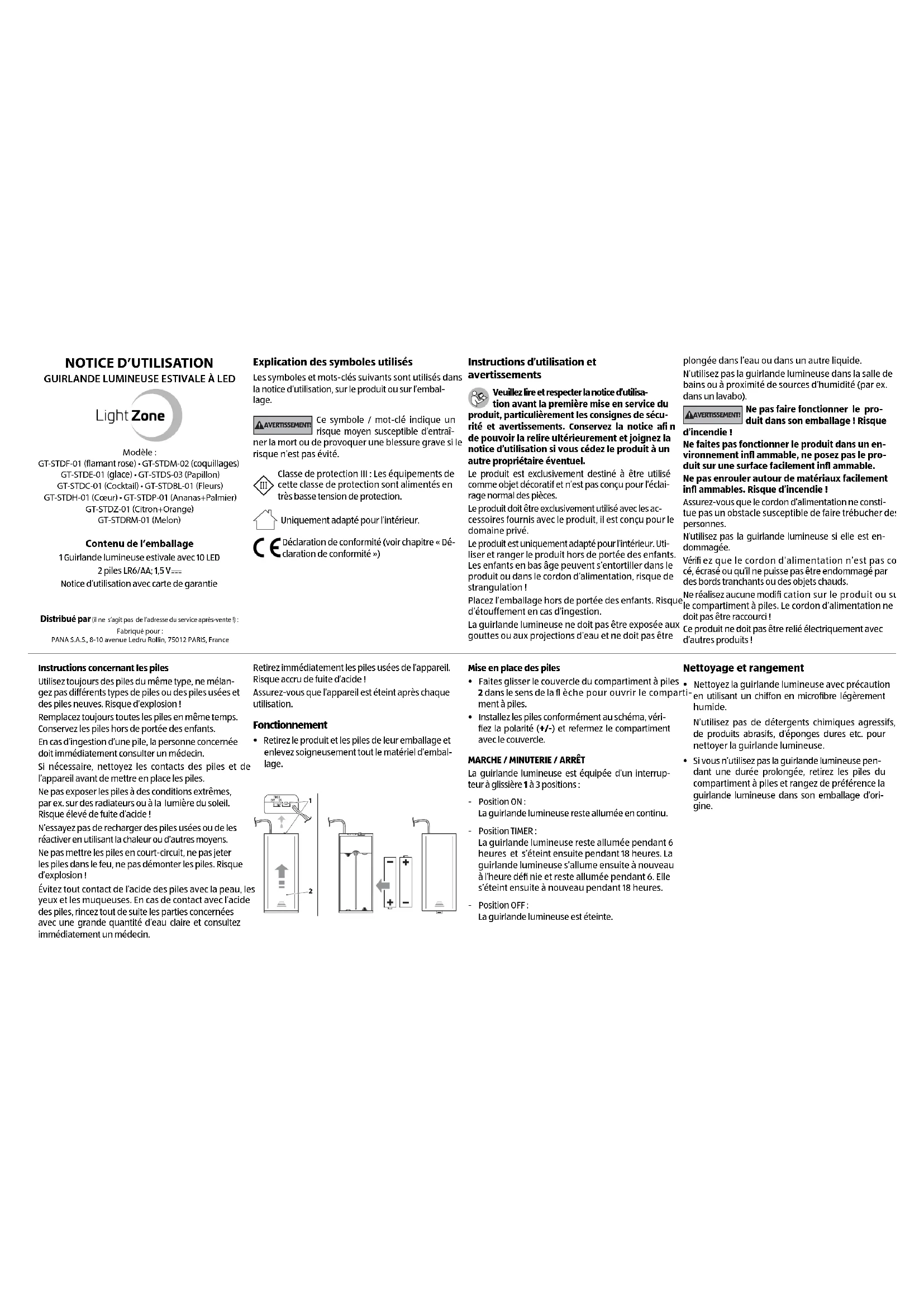 Modèle : GT-STDF-01 (fl amant rose) • GT-STDM-02 (coquillages) GT-STDE-01 (glace) • GT-STDS-03 (Papillon) GT-STDC-01 (Cocktail) • GT-STDBL-01 (Fleurs) GT-STDH-01 (Cœur) • GT-STDP-01 (Ananas+Palmier) GT-STDZ-01 (Citron+Orange) GT-STDRM-01 (Melon) Contenu de l’emballage 1 Guirlande lumineuse estivale avec 10 LED 2 piles LR6/AA; 1,5 V Notice d’utilisation avec carte de garantie Distribué par (il ne s’agit pas de l’adresse du service après-vente !) : Fabriqué pour :PANA S.A.S., 8-10 avenue Ledru Rollin, 75012 PARIS, France Nettoyage et rangement