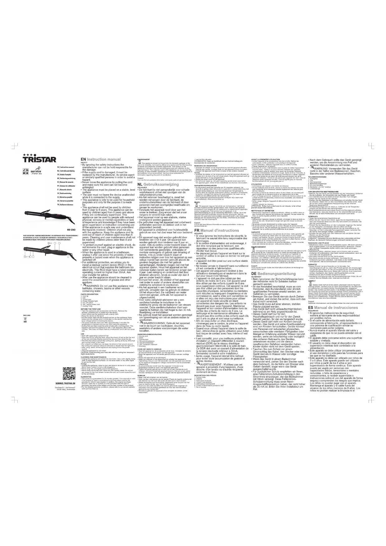 appareil à proximité d'une baignoire, d'une douche, d'un lavabo ou d'autres récipients contenant de l'eau. DESCRIPTIONDESPIÈCES1. Pointe froide2. Attache3. Appui pour le pouce4. Voyant d'alimentation5. Interrupteur marche/arrêt6. Cordon d'alimentation pivotant à 360°7. Fer à bouclerAVANTLAPREMIÈREUTILISATION• Sortez l'appareil et les accessoires hors de la boîte.Retirez lesautocollants, le film protecteur ou le plastique de l'appareil.• Avant l’utilisation, nettoyez l’appareil avec un chiffon humide.• Placez l'appareil sur le support.• Branchez le cordon d'alimentation dans la prise et mettez l'appareil enmarche (Note : Veillez à ce que la tension indiquée sur l’appareilcorresponde à celle du secteur local avant de connecter l'appareil.• Le témoin d'alimentation s'allume en rouge. Après environ 3 minutes, latempérature est atteinte et vous pouvez commencer à utiliser l'appareil.• Un peu de fumée et une odeur de brûlé peuvent émaner lors de lapremière utilisation. Tel est le cas parce que l’appareil est neuf. Cela sedissipera après quelques minutes. Cela ne signifie pas un mauvaisfonctionnement et n’en provoquera pas un.UTILISATION• Commencez par séparer une mèche de cheveux.• Ouvrez l'attache avec le levier, placez la mèche de cheveux de sorteque l'extrémité de la chevelure ressorte légèrement de l'attache puisfermez l'attache.• Enroulez la mèche de cheveux autour du fer à friser, en commençantpar la pointe de la chevelure puis en se rapprochant de la tête.• Pour un frisage prononcé, maintenez la mèche de cheveux autour du ferà friser environ 20 secondes, moins si vous souhaitez une chevelurelégèrement bouclée.• Après usage, éteignez l'appareil et débranchez-le de la source decourant.• Laissez refroidir les cheveux.ATTENTION: Évitez tout contact avec le cuir chevelu, le fer à friserpouvant causer des brûlures.NETTOYAGEETENTRETIEN• Débranchez l’appareil et laissez-le refroidir. Utilisez un chiffon doux unpeu humide pour essuyer les surfaces de l’appareil. Ne pas laisser del’eau ou autres liquides pénétrer dans l’appareil.Rangement• Débranchez l’appareil, laissez le refroidir, et rangez le dans sa boite oudans un lieu sec. Ne jamais le ranger tant qu’il est chaud ou encorebranché.• Ne jamais enrouler étroitement le cordon autour de l’appareil.• Ne jamais pendre l’appareil par le cordon. Rangez le cordon enroulésans trop serrer. Ne pas appliquer de pression au joint du cordon et del'appareil, car le cordon pourrait s'effilocher et se casser.GARANTIE• Ce produit est garanti pour une période de 24 mois. Votre garantie estvalable si le produit est utilisé selon les instructions et pour l'usageauquel il est destiné. De plus, la preuve d'achat d'origine (facture, reçuou ticket de caisse) doit être présentée, montrant la date d'achat, le nomdu détaillant et le numéro d'article du produit.• Pour connaître les conditions de garantie détaillées, veuillez consulternotre site Internet de service: www.service.tristar.euENVIRONNEMENT Cet appareil ne doit pas être jeté avec les déchets ménagers à la finde sa durée de vie, il doit être remis à un centre de recyclage pour lesappareils électriques et électroniques. Ce symbole sur l'appareil, lemanuel d'utilisation et l'emballage attire votre attention sur un pointimportant. Les matériaux utilisés dans cet appareil sont recyclables. Enrecyclant vos appareils, vous contribuez de manière significative à laprotection de notre environnement. Renseignez-vous auprès des autoritéslocales pour connaître les centres de collecte des déchets.SupportVous pouvez trouver toutes les informations et pièces de rechange surservice.tristar.eu! DEBedienungsanleitung SICHERHEIT