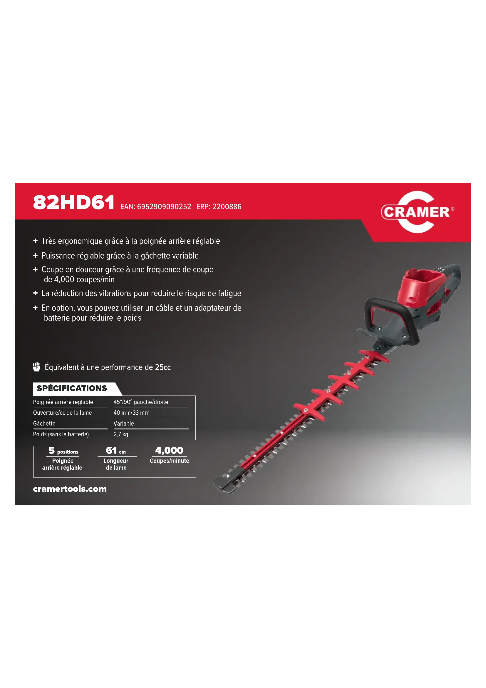 | Caractéristiques techniques | Modèle : Cramer 82HD61, Type : Taille-haies, Longueur de la lame : 61 cm, Poids : 3,5 kg, Puissance : 600 W, Vitesse de coupe : 3000 coupes/min |