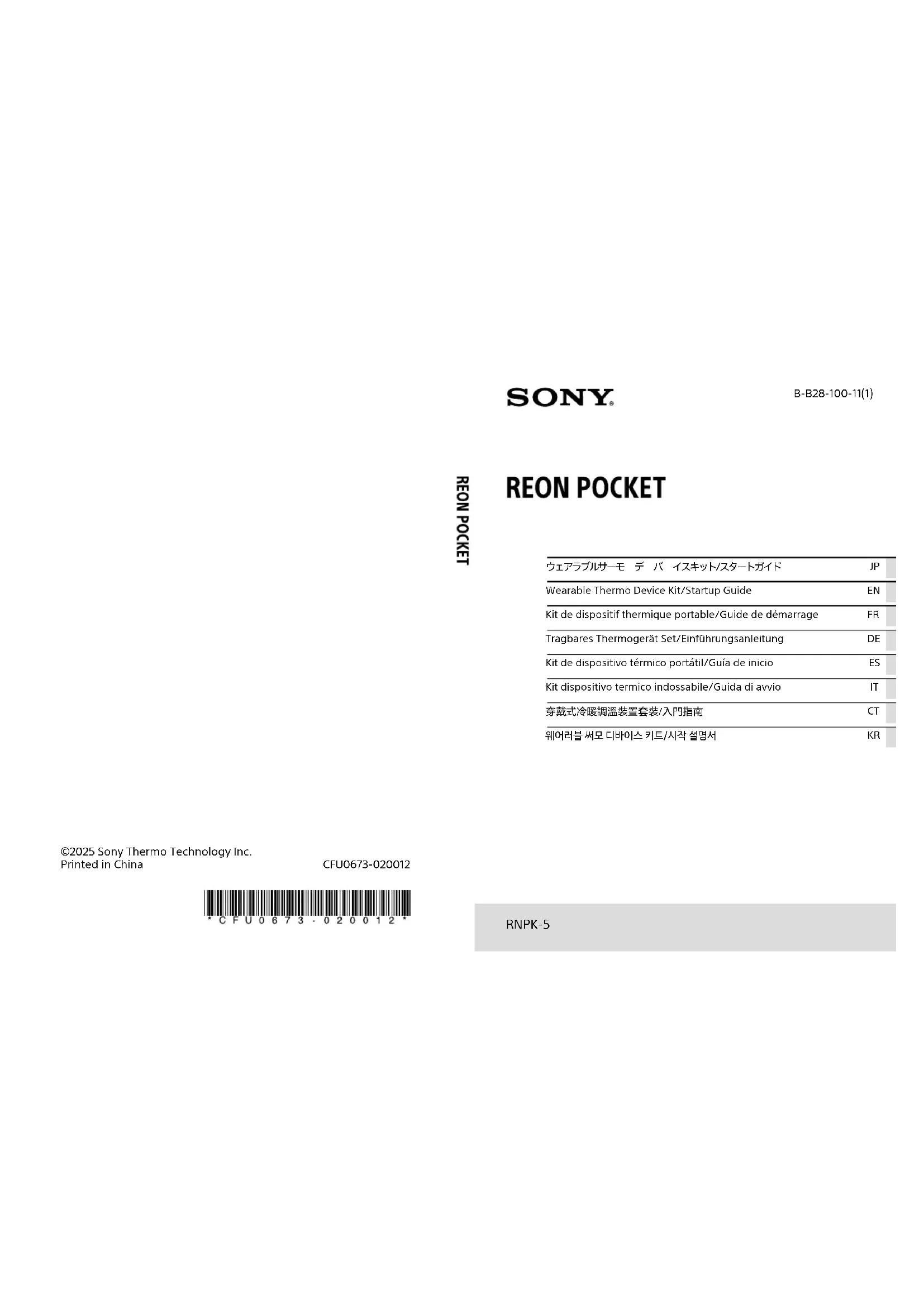 \\WIN-629\NewField\Reon_Pocket\Reon_Pocket_Phase5\REON5_SG_add_5lang\03_compose\BB28100111\BB28100111RNPK5XXX\03FR-RNPK5XXX\03FR.indd DTP data saved: 2025/01/06 15:43 PDF file created: 2025/01/06 15:44 Informations relatives à la sécurité À l’attention des clients en Europe Avis aux clients : les informations suivantes ne s’appliquent qu’aux équipements vendus dans les pays/ régions appliquant les directives de l’UE. Ce produit a été fabriqué par ou pour le compte de Sony Thermo Technology Inc. Importateur dans l’UE : Sony Europe B.V. Les questions basées sur la législation européenne pour l’importateur ou relatives à la conformité des produits doivent être adressées au mandataire: Sony Belgium, bijkantoor van Sony Europe B.V., Da Vincilaan 7-D1, 1930 Zaventem, Belgique. sony.com/country Le soussigné, Sony Thermo Technology Inc., déclare que cet équipement est conforme à la Directive 2014/53/UE. Le texte complet de la déclaration UE de conformité est disponible à l’adresse internet suivante : https://compliance.sony.eu Élimination des piles et accumulateurs et des équipements électriques et électroniques usagés (applicable dans les pays de l’Union Européenne et dans les autres pays disposant de systèmes de collecte sélective) Ce symbole apposé sur le produit, la pile ou l’accumulateur, ou sur l’emballage, indique que le produit et les piles et accumulateurs fournis avec ce produit ne doivent pas être traités comme de simples déchets ménagers. Sur certains types de piles, ce symbole apparaît parfois combiné avec un symbole chimique. Le symbole pour le plomb (Pb) est rajouté lorsque ces piles contiennent plus de 0,004% de plomb. En vous assurant que les produits, piles et accumulateurs sont mis au rebut de façon appropriée, vous participez activement à la prévention des conséquences négatives que leur mauvais traitement pourrait provoquer sur l’environnement et sur la santé humaine. Le recyclage des matériaux contribue par ailleurs à la préservation des ressources naturelles. Pour les produits qui, pour des raisons de sécurité, de performance ou d’intégrité des données, nécessitent une connexion permanente à une pile ou à un accumulateur intégré(e), il conviendra de vous rapprocher d’un service technique qualifié pour effectuer son remplacement. En rapportant votre appareil électrique, les piles et accumulateurs en fin de vie à un point de collecte approprié, vous vous assurez que le produit, la pile ou l’accumulateur intégré sera traité correctement. Pour tous les autres cas de figure et afin d’enlever les piles ou accumulateurs en toute sécurité de votre appareil, reportez- vous au manuel d’utilisation. Rapportez les piles et accumulateurs, et les équipements électriques et électroniques usagés au point de collecte approprié pour le recyclage. Pour toute information complémentaire au sujet du recyclage de ce produit ou des piles et accumulateurs, vous pouvez contacter votre municipalité, votre déchetterie locale ou le point de vente où vous avez acheté ce produit. La validité du marquage CE est limitée aux seuls pays/régions dans lesquels il est légalement en vigueur, principalement dans les pays/régions de l’EEE (Espace économique européen) et en Suisse.RNPK-5 B-B28-100-11(1)