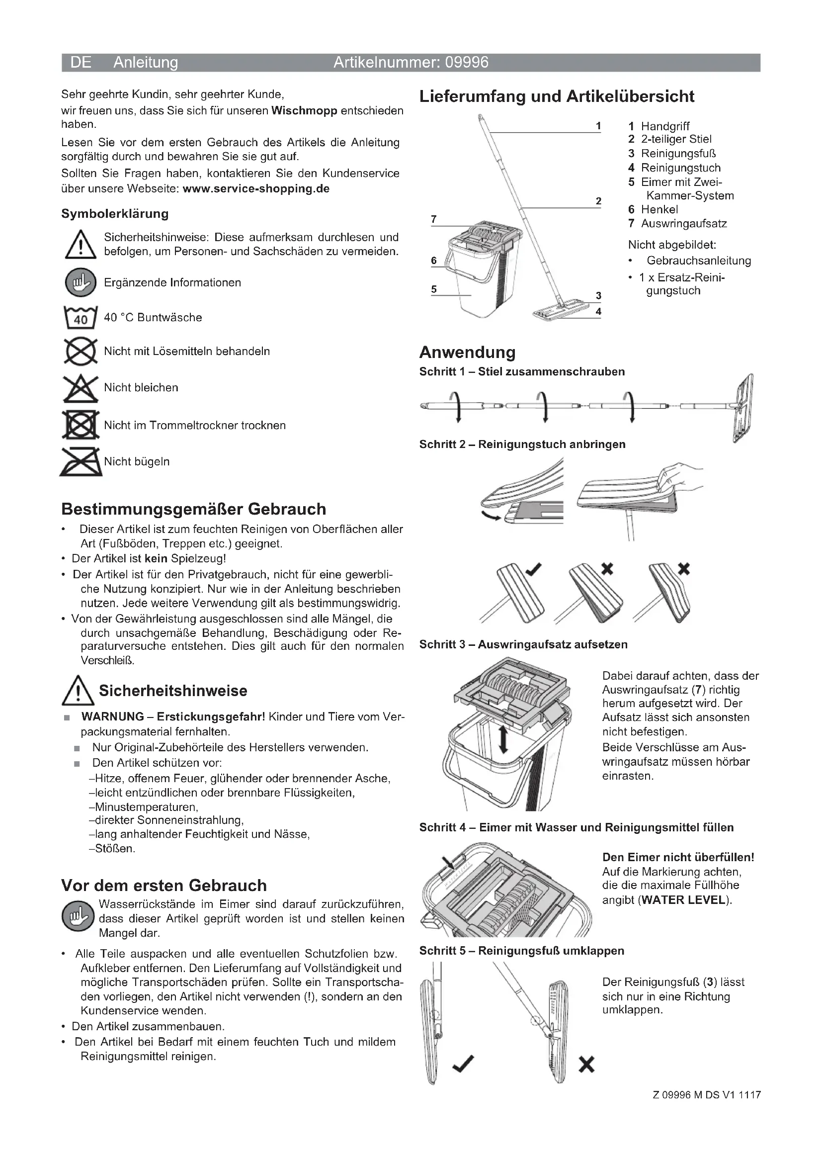 - Si nécessaire, nettoyez l’article avec un chiffon humide et un peu de détergent doux. Référence article : 09996 Z 09996 M DS V1 1117 Composition et vue générale de l’article 1 Poignée 2 Manche en deux parties 3 Pied de nettoyage 4 Lingette de net- toyage 5 Seau avec système à deux bacs 6 Anse 7 Essoreuse Non illustrés :