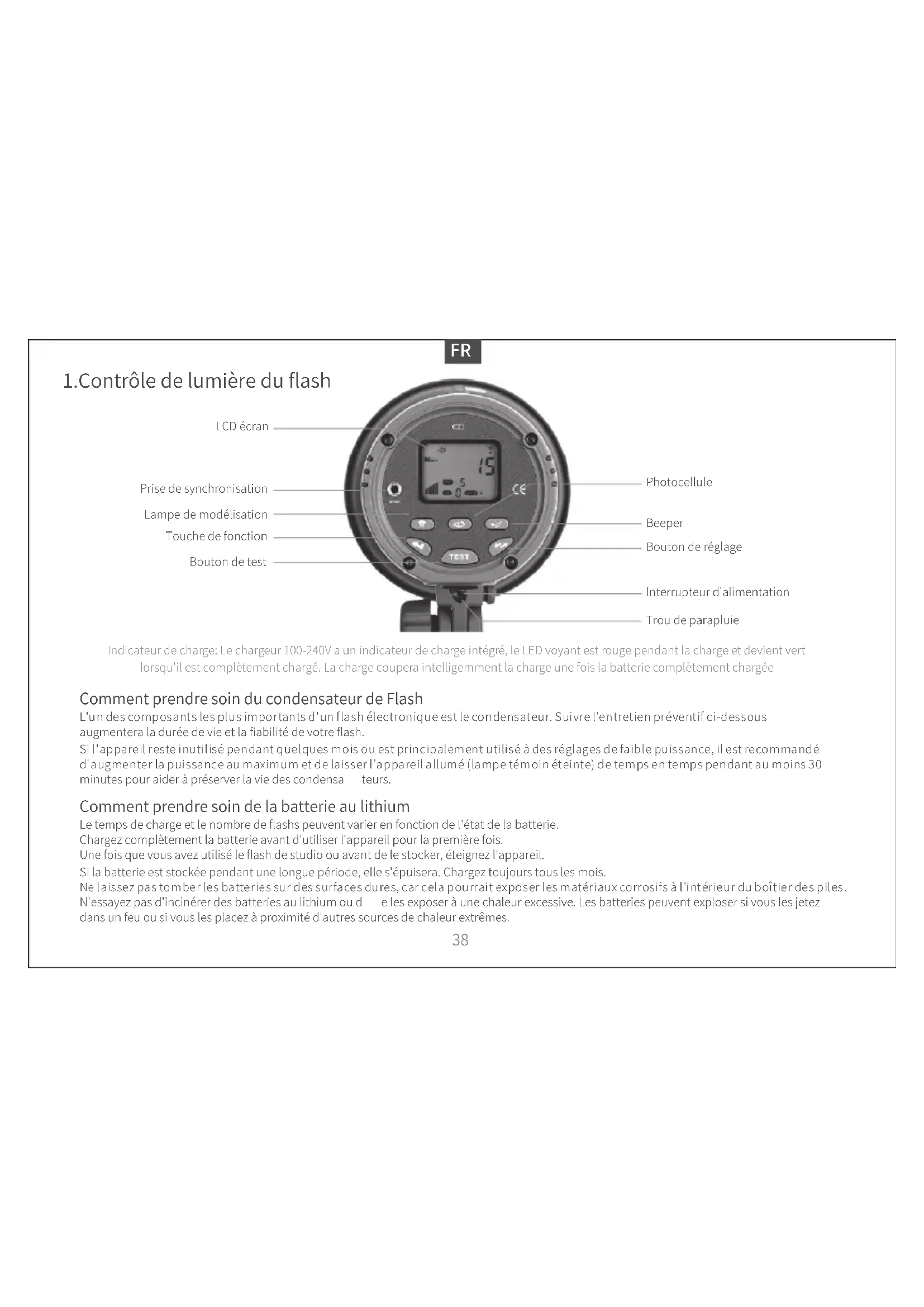 1.Contrôle de lumière du flash LCD écran Prise de synchronisation Lampe de modélisation Touche de fonction Bouton de test Photocellule Beeper Bouton de réglage Interrupteur d'alimentation Trou de parapluie Indicateur de charge: Le chargeur 100-240V a un indicateur de charge intégré, le LED voyant est rouge pendant la charge et devient vert lorsqu'il est complètement chargé. La charge coupera intelligemment la charge une fois la batterie complètement chargée L'un des composants les plus importants d'un flash électronique est le condensateur. Suivre l'entretien préventif ci-dessous augmentera la durée de vie et la fiabilité de votre flash. Si l'appareil reste inutilisé pendant quelques mois ou est principalement utilisé à des réglages de faible puissance, il est recommandé d'augmenter la puissance au maximum et de laisser l'appareil allumé (lampe témoin éteinte) de temps en temps pendant au moins 30 minutes pour aider à préserver la vie des condensa teurs. Le temps de charge et le nombre de flashs peuvent varier en fonction de l'état de la batterie. Chargez complètement la batterie avant d'utiliser l'appareil pour la première fois. Une fois que vous avez utilisé le flash de studio ou avant de le stocker, éteignez l'appareil. Si la batterie est stockée pendant une longue période, elle s'épuisera. Chargez toujours tous les mois. Ne laissez pas tomber les batteries sur des surfaces dures, car cela pourrait exposer les matériaux corrosifs à l'intérieur du boîtier des piles. N'essayez pas d'incinérer des batteries au lithium ou d e les exposer à une chaleur excessive. Les batteries peuvent exploser si vous les jetez dans un feu ou si vous les placez à proximité d'autres sources de chaleur extrêmes. Comment prendre soin de la batterie au lithium Comment prendre soin du condensateur de Flash FRLe flash de studio contient les trois menus différents suivants: 3.Trois types de modes de menu Allumez l'appareil, vous verrez le PREMIER MENU avec le réglage de la puissance de sortie, le réglage de la durée du flash, le réglage des flashs continus et le réglage de la fréquence du flash. Après avoir appuyé sur le bouton ( ) de fonction pendant 4 secondes, vous entrerez dans le SECONDE MENU avec le réglage de pré-flash, le réglage du canal radio 2,4G, le réglage de la fonction de groupe Après avoir appuyé sur le bouton ( ) de fonction pendant 8 secondes, vous entrerez dans le TROISIÈME MENU avec un régla ge spécial de pré-flash. Remarque: L'affichage quittera automatiquement le deuxième menu ou le troisième menu vers le premier menu si aucun bouton n'est appuyé dans 20 secondes, ou appuyez sur la touche de fonction pendant ( ) 3 secondes. ATTENTION: pour éviter la déformation du capuchon de protection en plastique, toujours refroidir le flash avant de monter le capuchon de protection Pour retirer le capuchon de protection, repoussez le bouton de verrouillage vers l'arrière de l'appareil et tournez le capuchon de protection dans le sens anti-horaire. Mettez le capuchon de protection de côté. 2.Desserrer le capuchon de protection Installez le réflecteur où le capuchon de protection était avant, alignez les trois chevilles du réflecteur avec les trois fentes, appuyez sur le réflecteur et tourne z-le dans le sens horaire jusqu'à ce qu'il se verrouille en place. Éteignez toujours l'appareil avant d'installer et de changer les réflecteurs. Installer le réflecteur Ne touchez pas la lampe à mains nues. L'huile de vos doigts peuvent faire chauffer la surface de la lampe de manière inégale et exploser. Utilisez des gants en coton blanc ou un chiffon propre. Veillez à ne pas endommager le flashtube lors du montage ou du retrait des réflecteurs ou des boîtes souples. Le tube flash est très délicat. Chargeur de batterie et indicateur de charge 1.Chargeur AC: Insérez une extrémité avec une fiche de 5,5 mm dans le port de charge de la batterie au lithium et l'autre extrémité du chargeur dans une prise mise à la terre. Le chargeur de batterie de flash studio VISION4 est développé pour une utilisation internationale dans la gamme AC 100-240v.Une batterie complètement épuisée atteint sa pleine puissance après 5 heures de charge.En fonction de l'état de la batterie, les heures de charge peuvent changer.
